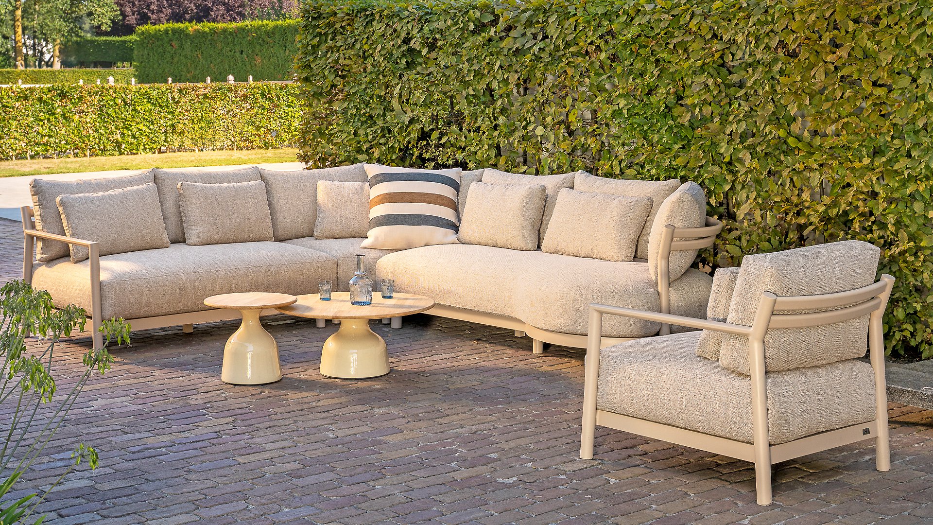 Entdecken Sie das 4 Seasons Outdoor Mykonos Lounge-Seteine stilvolle Hommage an die gleichnamige griechische Insel, wo Luxus, Ruhe und Eleganz aufeinandertreffen. Genau wie Mykonos selbst eine Atmosphäre purer Entspannung verströmt, bringt dieses Lounge-Set dasselbe Gefühl auf Ihre Terrasse oder in Ihren Garten. Wie Sie es von 4 Seasons Outdoor erwarten, ist die Qualität unübertroffen. Gefertigt aus hochwertigen, wetterfesten Materialien, ist das Set beständig gegen Regen, Sonne und Salz. Dank dieser langlebigen Oberfläche behält das Lounge-Set sein luxuriöses Aussehen über Jahre hinweg. Und um dieses Vertrauen zu unterstreichen, erhalten Sie eine volle 5-Jahres-Garantie – eine beruhigende Gewissheit, dass Sie in dauerhafte Qualität investieren. Mit seinen großzügigen Proportionen, eleganten Linien und einladendem Sitzkomfort schafft Mykonos eine Atmosphäre, die an laue Abende in der Ägäis erinnert. Hier wird das ultimative Outdoor-Living zum Leben erweckt.
