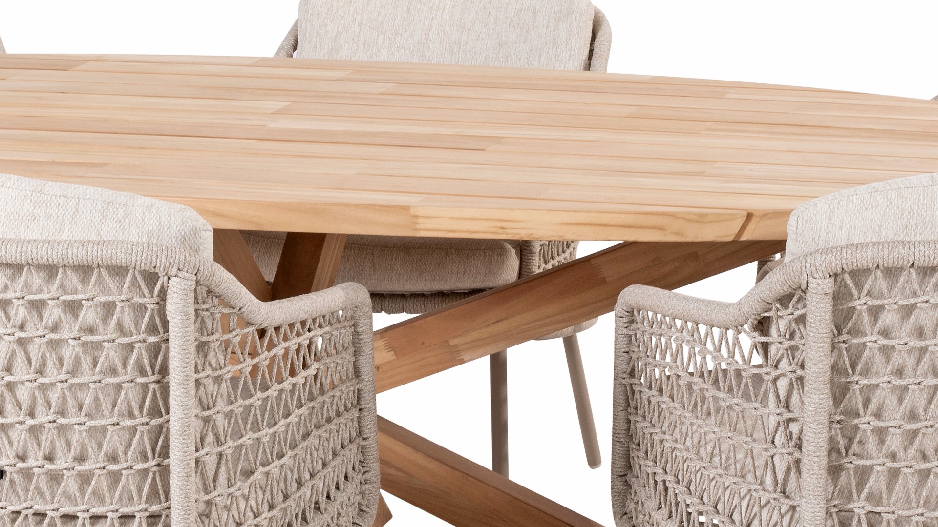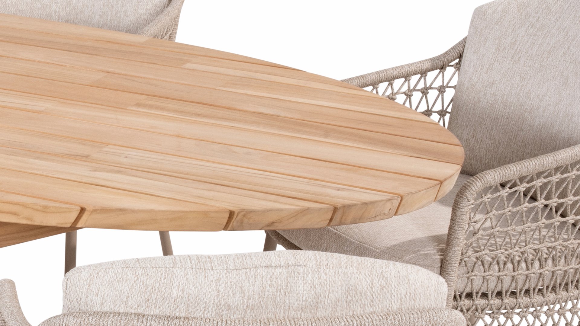 Die Taste by 4Seasons Prado Ellips kann ruhig als Kunstwerk bezeichnet werden. Schau mal, wie kunstvoll dieses Bein-Design ist. Die dicke Teakholzplatte ist schräg und verleiht dem Tisch etwas Luftiges. Kombinierbar mit unserer gesamten Kollektion von Gartensesseln. Auch mit Gestell in Anthrazit, Teak, Latte oder Terre erhältlich: