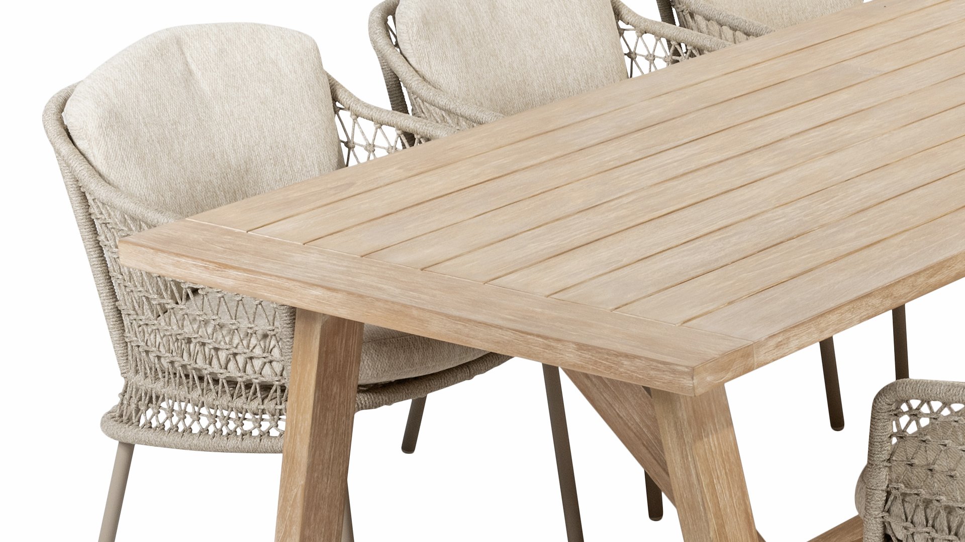 Der Noah-Tisch aus gebürstetem Teakholz von Taste 4SO ist ein robuster Tisch, der Eleganz ausstrahlt. Das Teakholz ist gebürstet, was bedeutet, dass es eine raue, natürliche Oberfläche mit leichten Akzenten in den Rillen hat. Dieses Finish verleiht dem Tisch ein einzigartiges Aussehen. Die Größe 260 bietet ausreichend Sitzfläche an diesem Tisch. Der Noah-Tisch ist auch im normalen Teakholz-Finish und mit einem Edelstahlgestell erhältlich.
