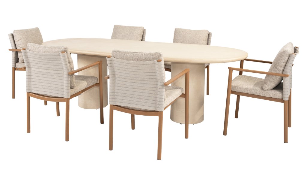 Entdecken Sie Hampton: die perfekte Balance zwischen raffinierter Eleganz und robuster Schlichtheit. Dieser wunderschöne Gartentisch in stilvollem Beige/Weiß strahlt Ruhe und Luxus aus und ist das Herzstück jedes Außenbereichs – vom gemütlichen Abendessen bis zum langen Sommerabend mit Freunden und Familie. Der Hampton ist aus hochwertigem Mortex gefertigt, einem langlebigen und wasserfesten Material, das für seine natürliche Optik und außergewöhnliche Wetterbeständigkeit bekannt ist. Jede Tischplatte wird von Hand bearbeitet und schafft so einen einzigartigen, warmen Look, der sowohl moderne als auch mediterrane Gärten perfekt ergänzt. Der Tisch ist in verschiedenen Größen erhältlich, sodass Sie immer den passenden Hampton für Ihren Außenbereich finden. Wählen Sie die runde Version mit Ø160cm für eine gemütliche Atmosphäre mit einem einzelnen, eleganten Mittelbein oder die großzügigen ovalen Versionen mit 240cm oder 300cm. Beide verfügen über zwei schlanke, vertikale Beine, die für Stabilität und ein markantes, geradliniges Design sorgen. Für alle, die ein entspannteres Essen bevorzugen, gibt es auch eine Low-Dining Version Ø160cm, ideal für entspannte Momente im Lounge-Stil.
