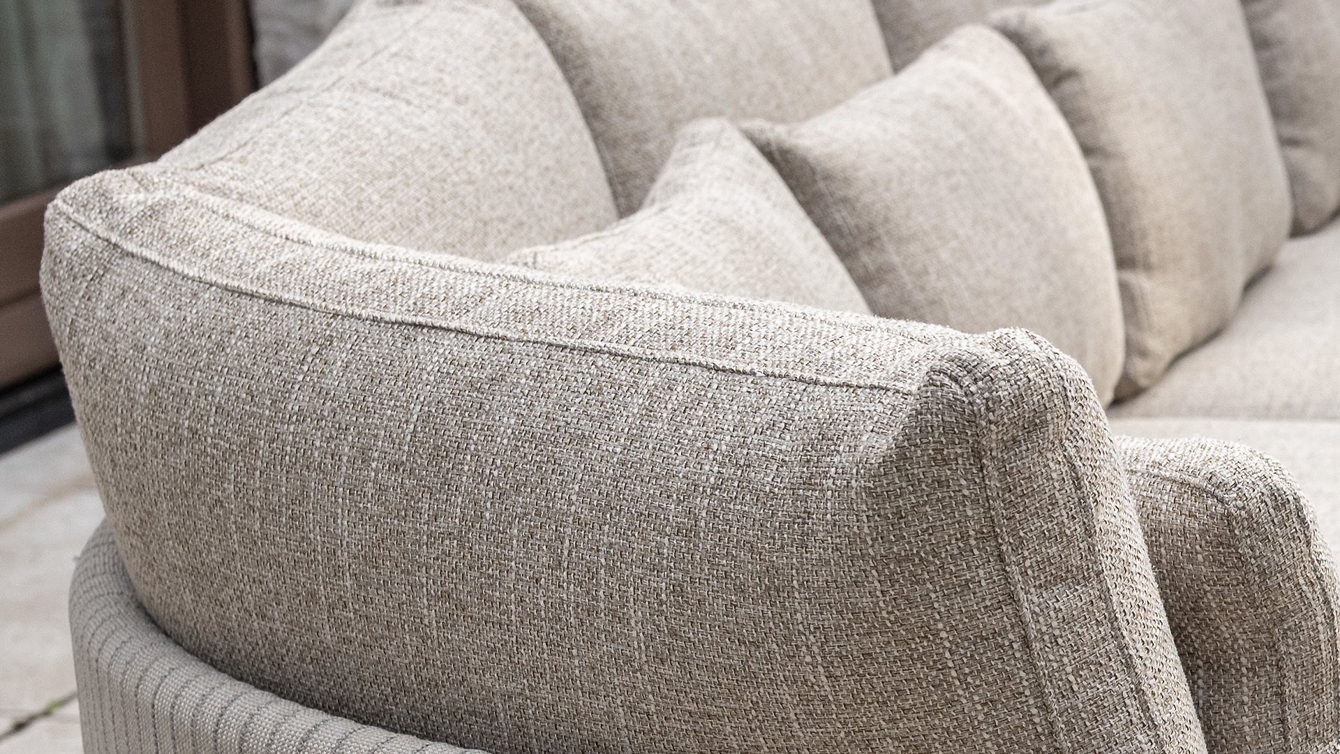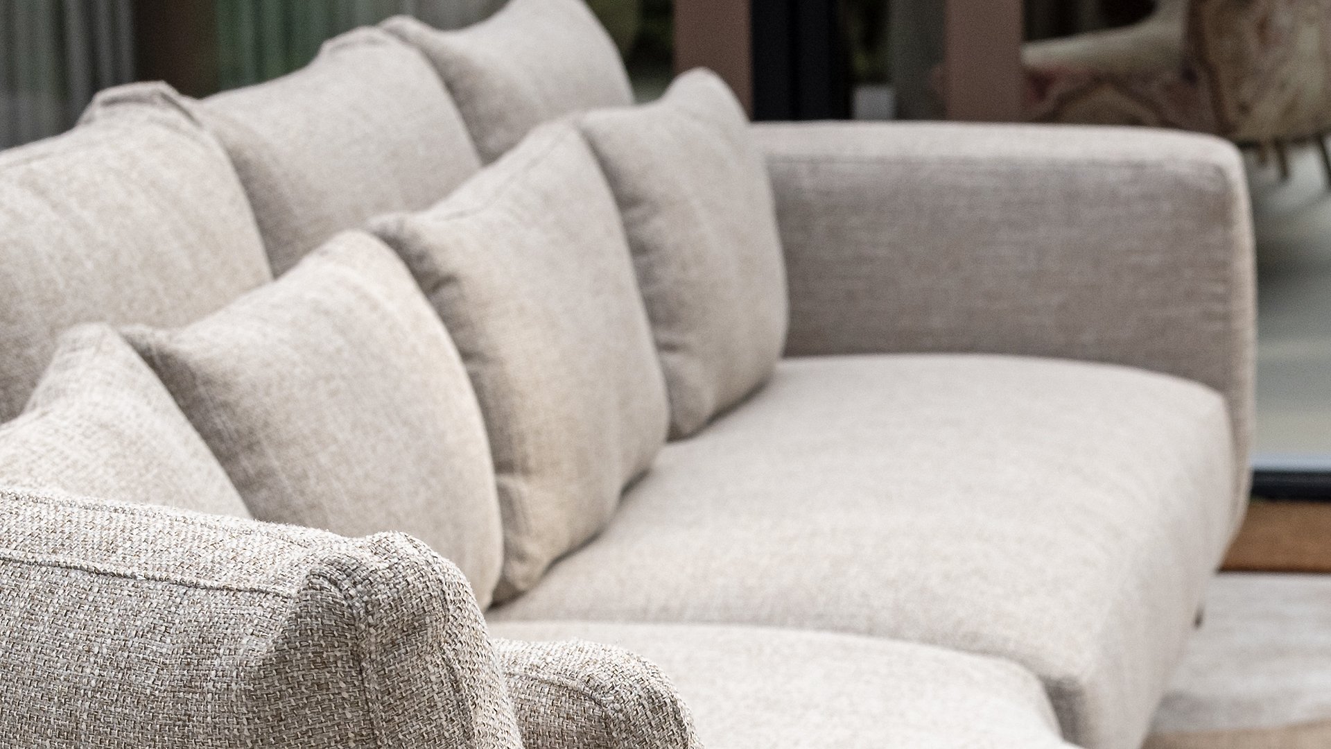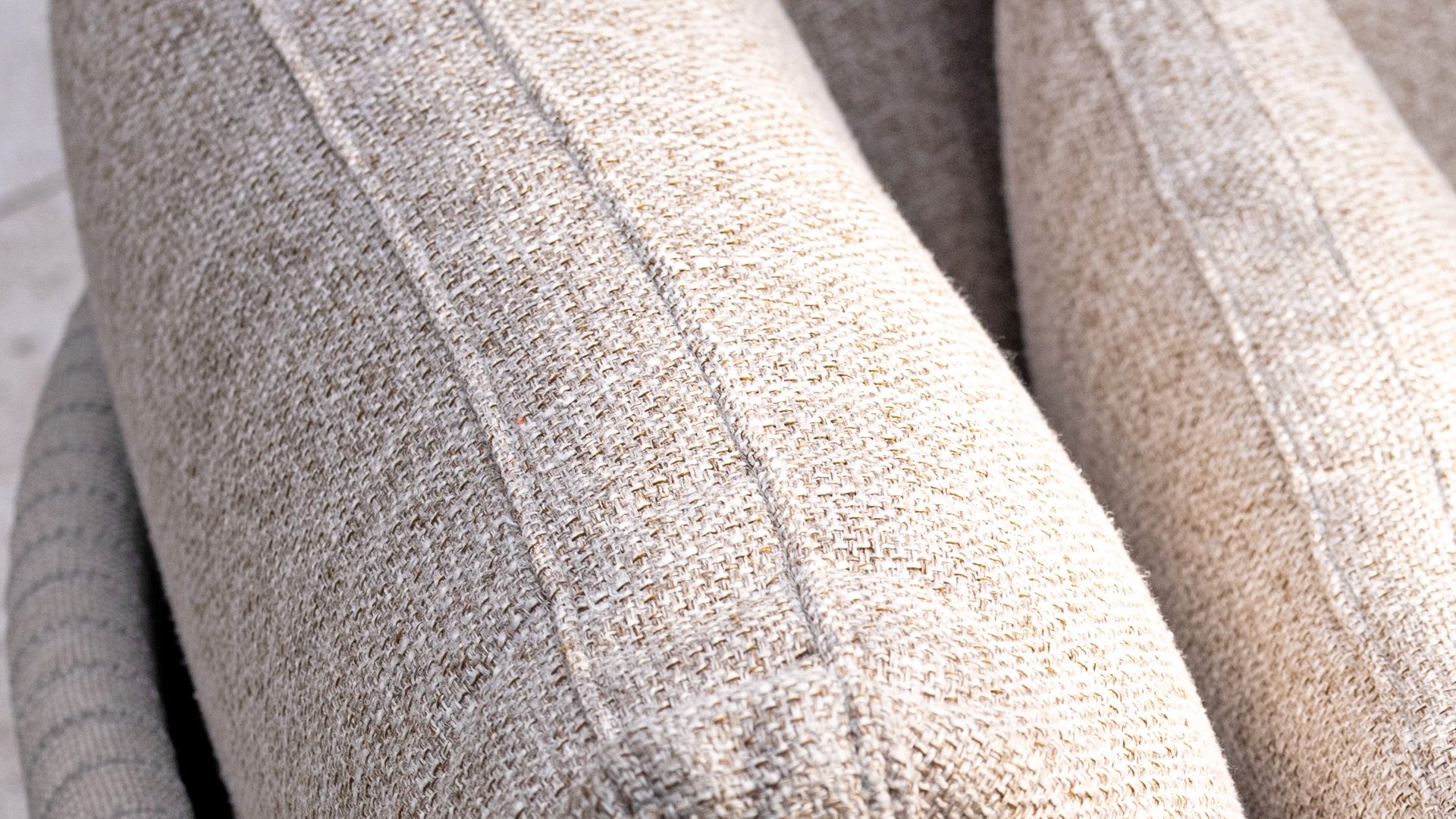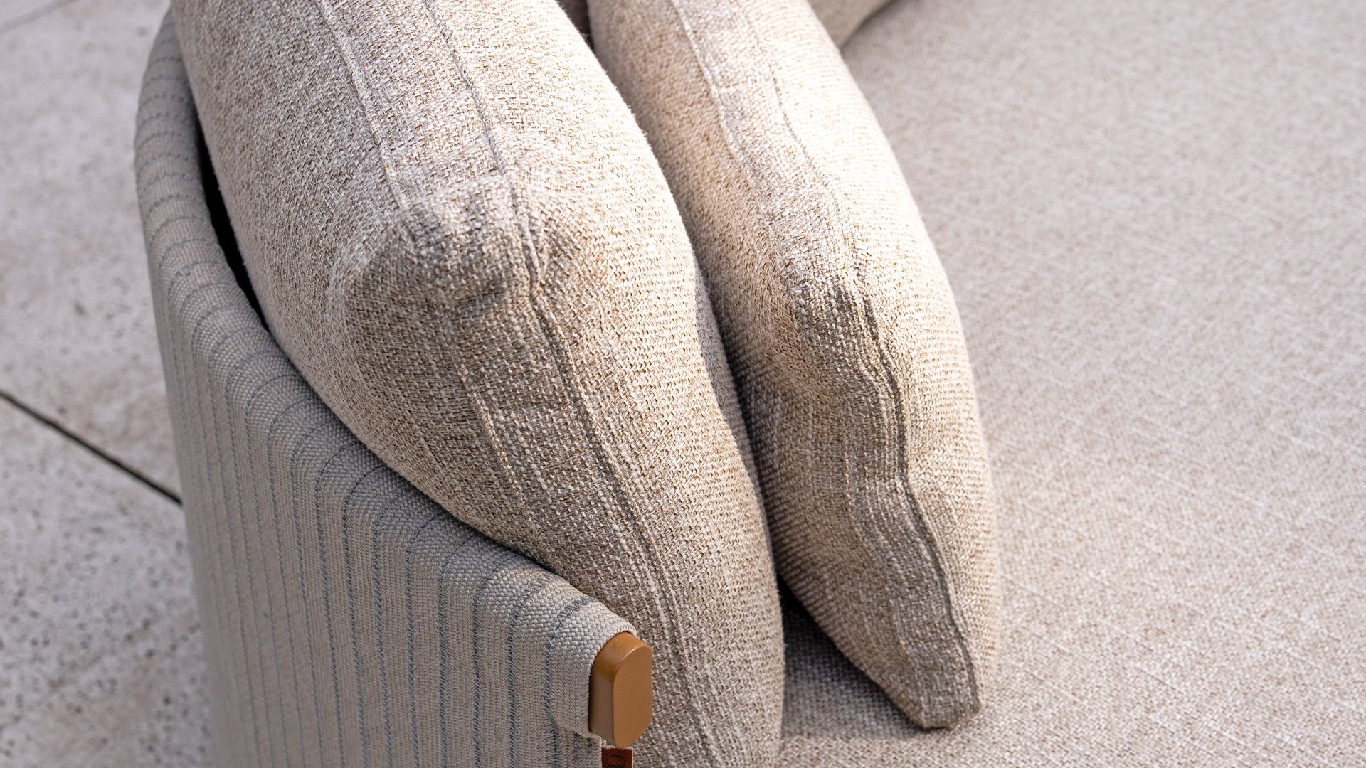 * Harmonische Farbpalette mit weichen, sandfarbenen Kissen.