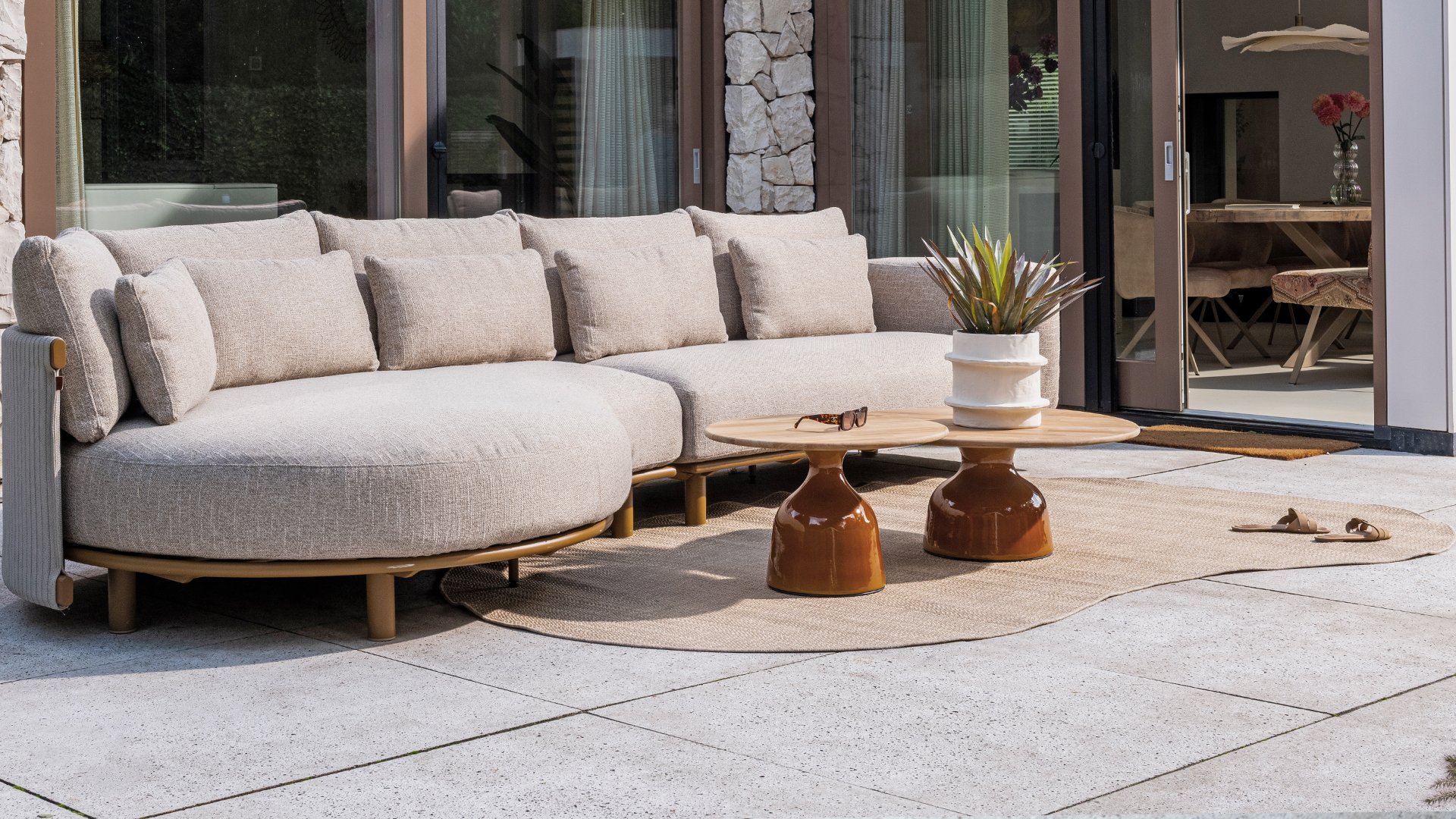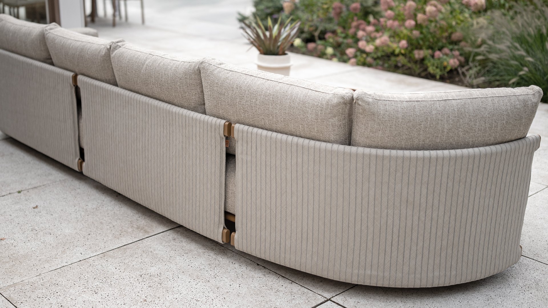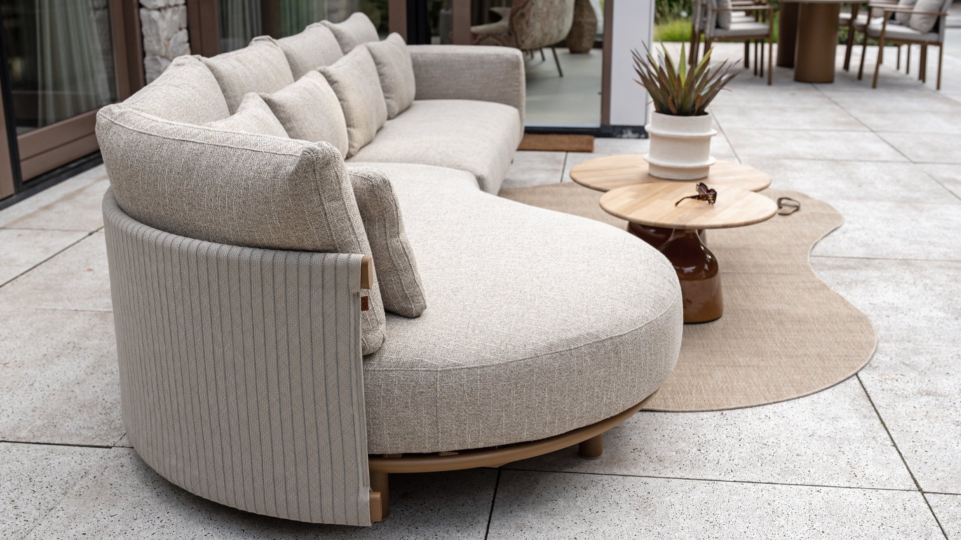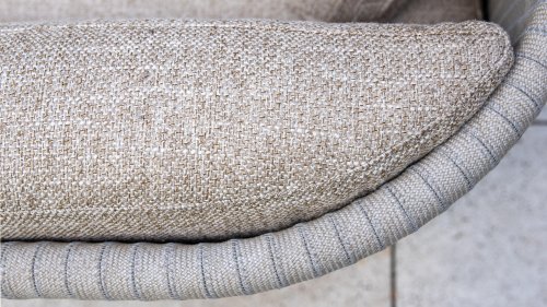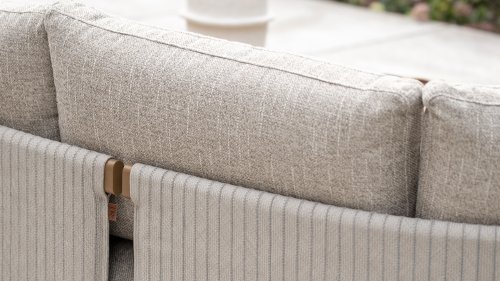 Das sandfarbene Rope ist vollständig gepolstert und mit außergewöhnlicher Handwerkskunst verarbeitet, was dem Safina Lounge-Set eine warme und luxuriöse Ausstrahlung verleiht. Der amber Aluminiumrahmen bildet eine moderne, robuste und pflegeleichte Basis. Zusammen mit den sandfarbenen Kissen – wetterfest, komfortabel und stilvoll – entsteht ein harmonisches und hochwertiges Gesamtbild, das perfekt zu jedem Garten oder jeder Terrasse passt.