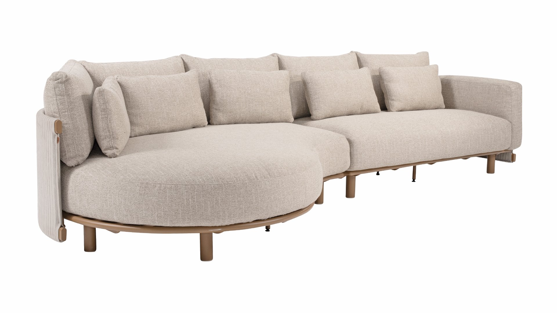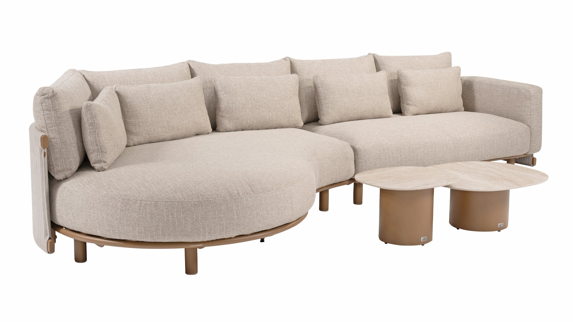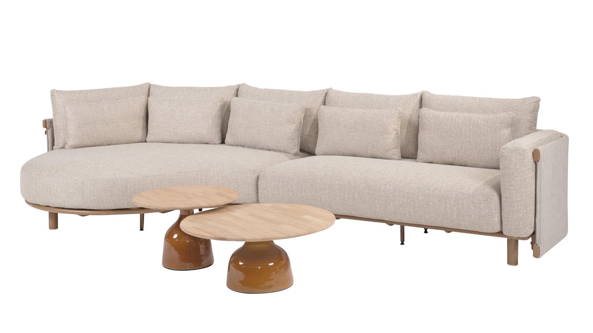 Das sandfarbene Rope ist vollständig gepolstert und mit außergewöhnlicher Handwerkskunst verarbeitet, was dem Safina Lounge-Set eine warme und luxuriöse Ausstrahlung verleiht. Der amber Aluminiumrahmen bildet eine moderne, robuste und pflegeleichte Basis. Zusammen mit den sandfarbenen Kissen – wetterfest, komfortabel und stilvoll – entsteht ein harmonisches und hochwertiges Gesamtbild, das perfekt zu jedem Garten oder jeder Terrasse passt.