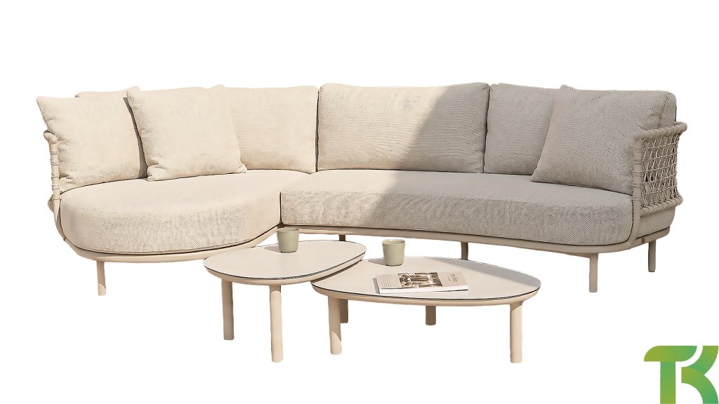 Natürliche Ausstattung: Der Latte-Seil-Bezug wird auf dem Sofa in einer natürlichen, warmen und Outdoor-Ausstattung platziert, perfekt für eine angenehme Entspannung.