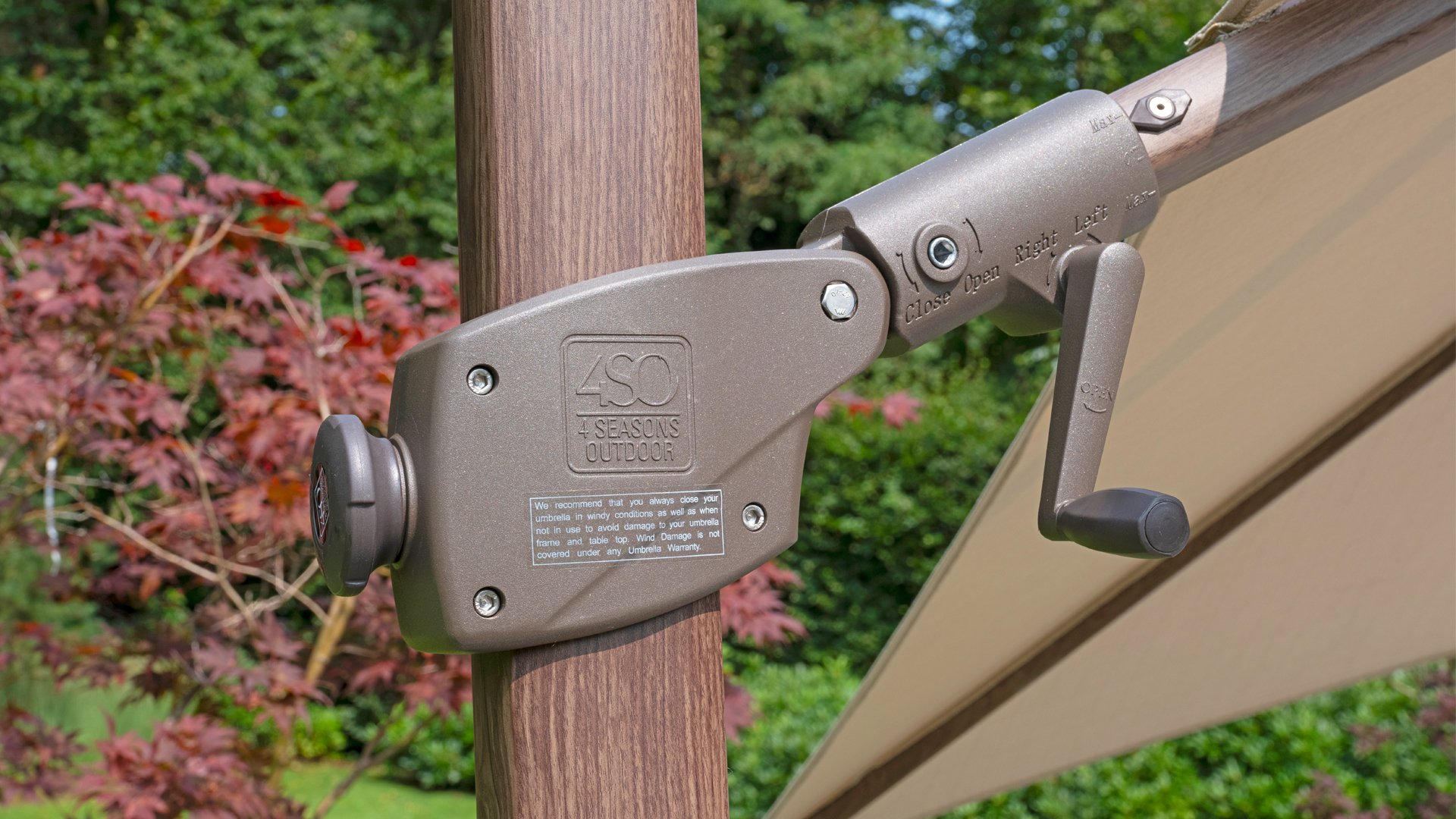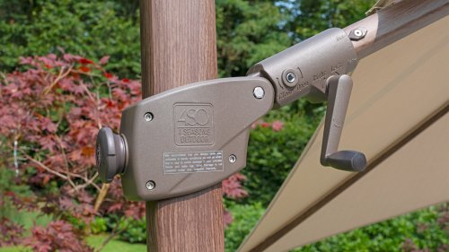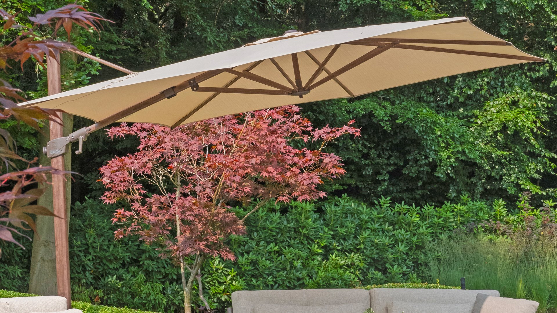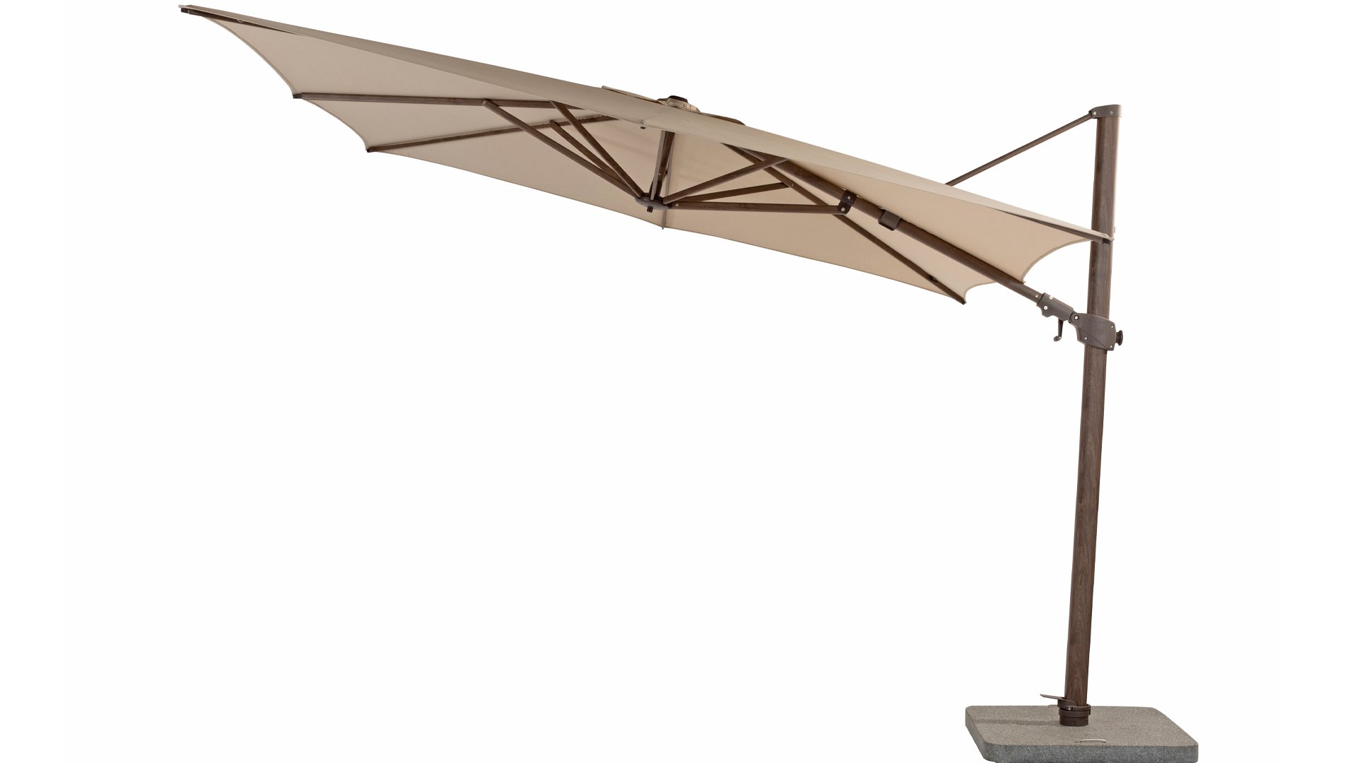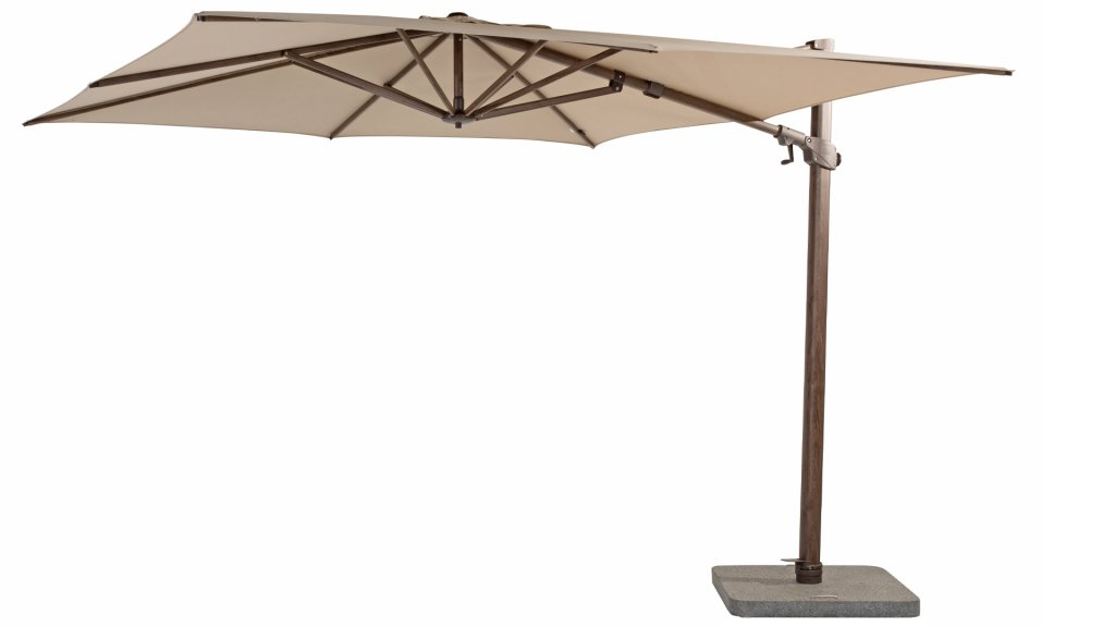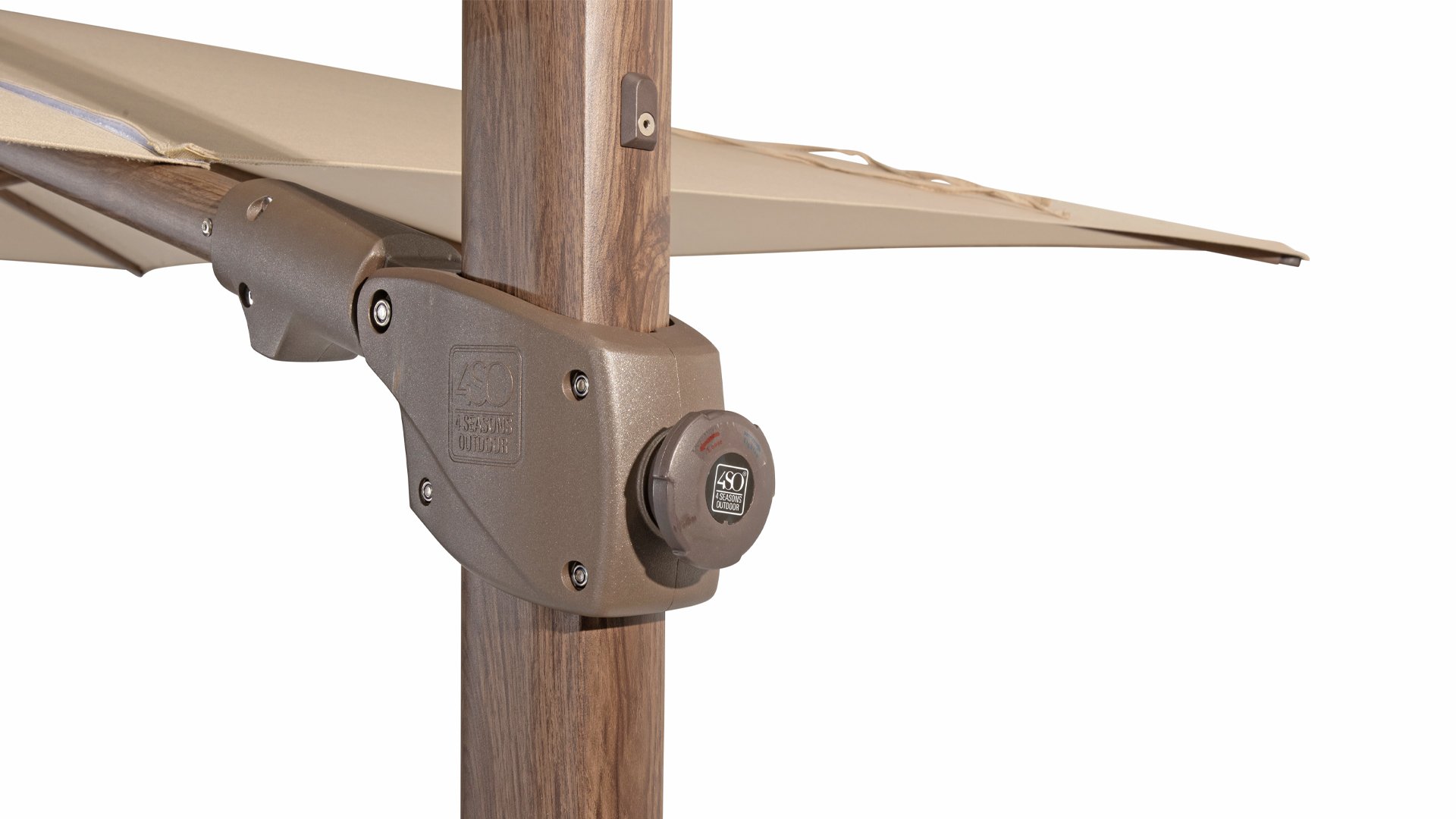 Jeder Freiarmparasol von 4Seasons Outdoor kann auf der Sockel gedreht und nach hinten gekippt werden, um die tiefstehende Sonne aufzufangen. Diese Premium-Variante kann auch seitlich kippen.
