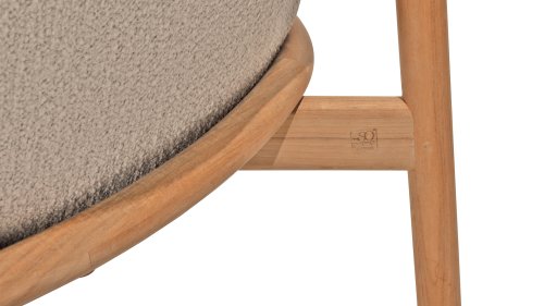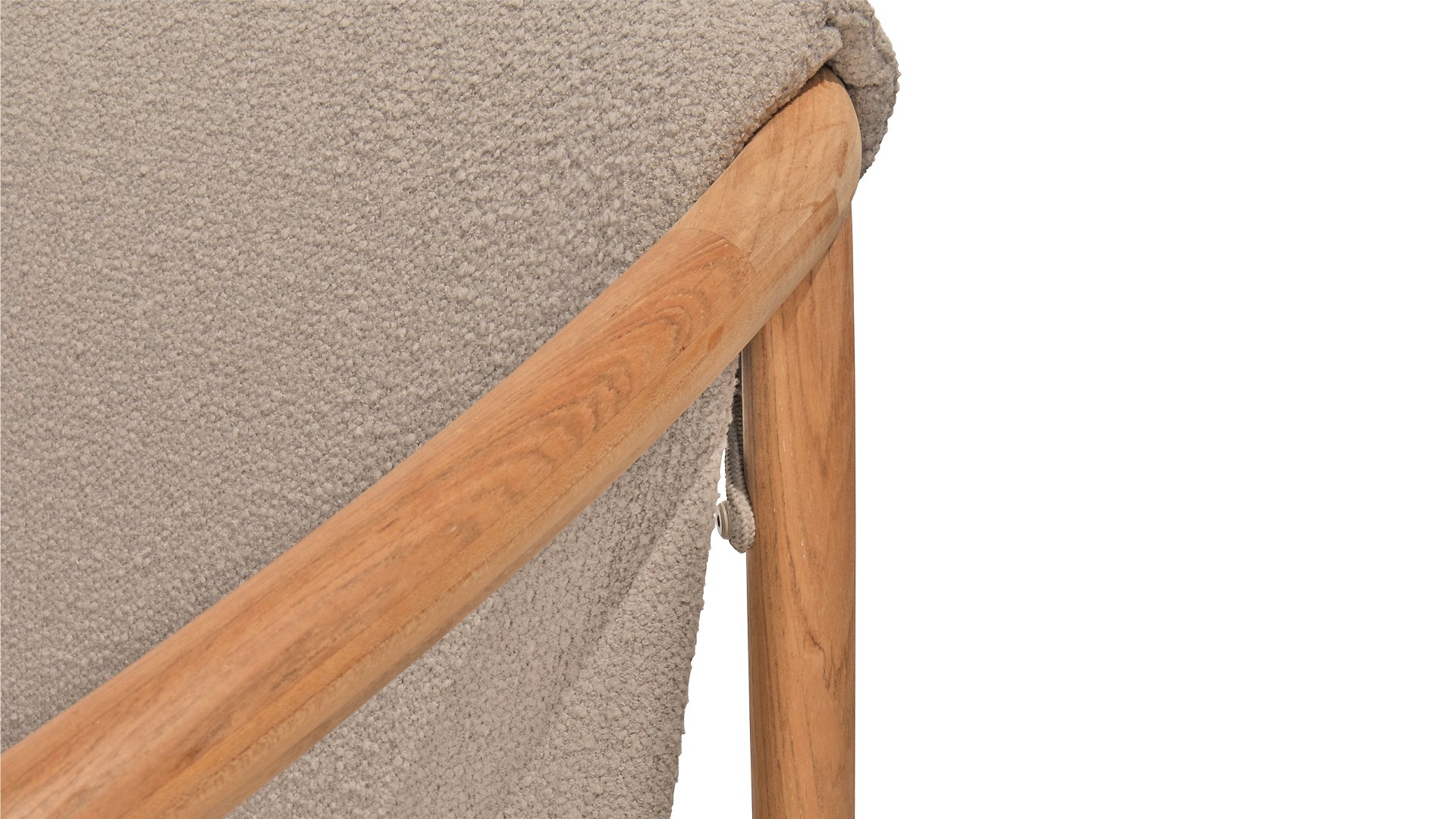 - Stilvolles und zeitloses Design: Die Kombination aus Teakholz und taupefarbenem Bouclé schafft eine elegante, beruhigende Atmosphäre in jedem Garten.