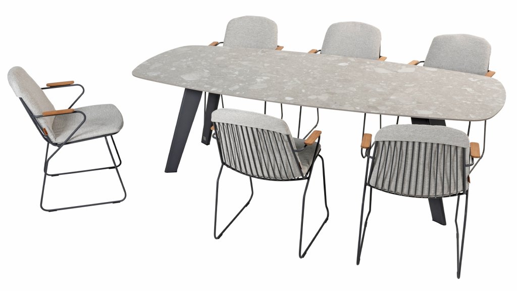 Der 4Seasons Outdoor Montana ist ein wunderschöner Tisch, der sofort ins Auge fällt. Es sieht nicht nur modern aus, sondern ist durch die Form der Tischplatte auch äußerst praktisch. Der Tisch zeichnet sich durch seine dänisch-ovale Tischplatte aus, die Form schafft ausreichend Platz auf allen Seiten des Tisches. Bei der Montana-Serie gibt es mehrere Optionen; Die 240 cm hohe Terrazzo-Keramikplatte kann mit einem Untergestell aus Edelstahl oder Teakholz kombiniert werden. Innerhalb der Montana-Serie gibt es auch einen 280 cm großen Tisch mit HPL-Platte.
