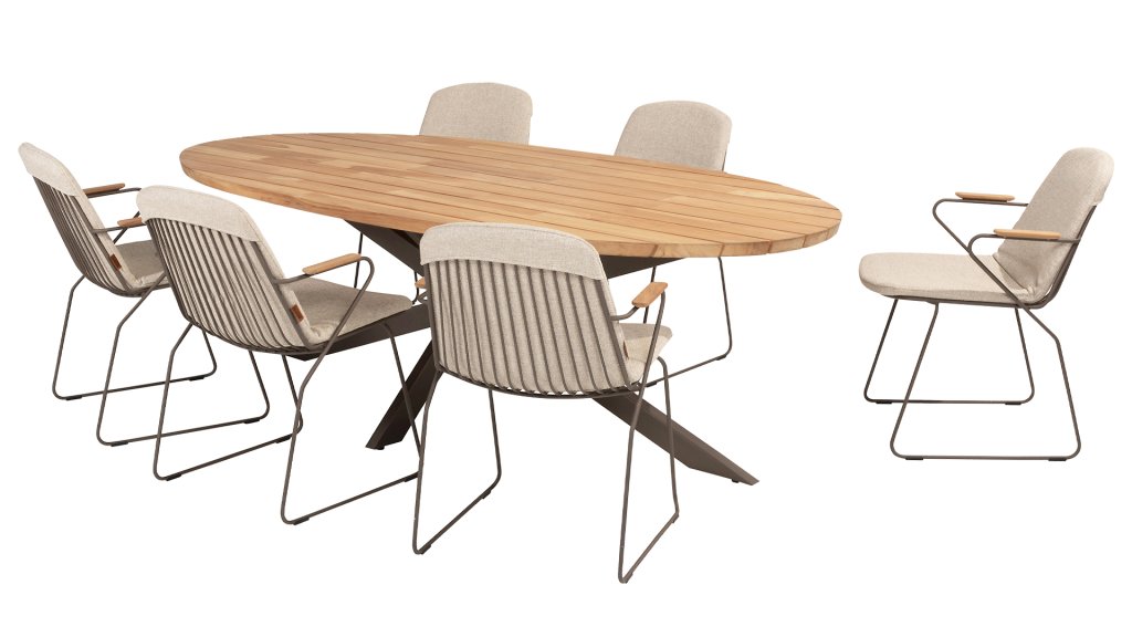 Die Taste by 4Seasons Prado Ellipse kann getrost als Kunstwerk bezeichnet werden. Schauen Sie sich an, wie kunstvoll dieses Beinset zusammengestellt ist. Die dicke Teakplatte hat eine abgeschrägte Seite und verleiht dem Tisch etwas Luftiges. Kann mit unserer gesamten Kollektion an Gartenstühlen kombiniert werden. Auch mit Anthrazit-, Teak-, Latte- oder Terre-Untergestell erhältlich