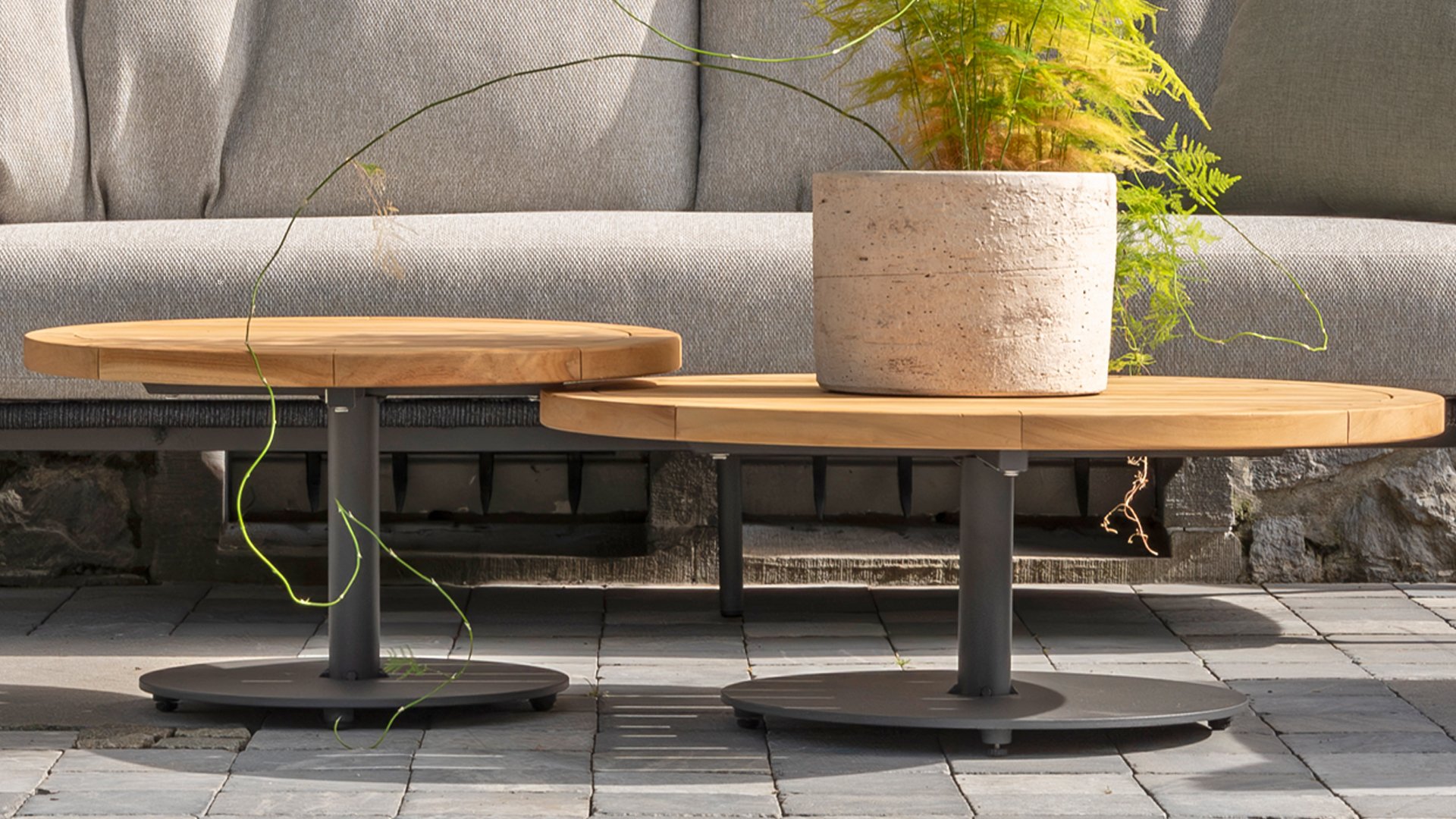 Entdecken Sie die Schönheit und Vielseitigkeit des 4 Seasons Outdoor Volta Runden Couchtisches mit seiner wunderschönen Teakholzplatte und dem Edelstahlrahmen. Dieser Tisch verleiht Ihrem Außenbereich eine natürliche Eleganz und wurde mit Liebe zum Detail entworfen.
