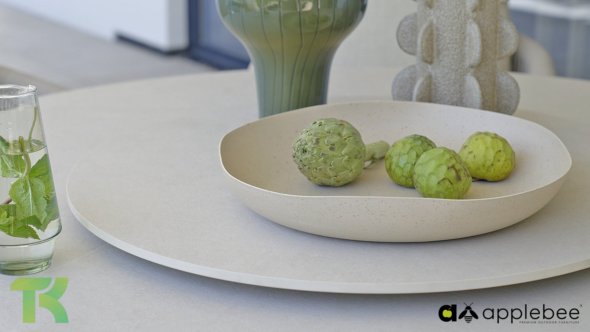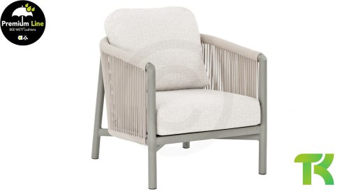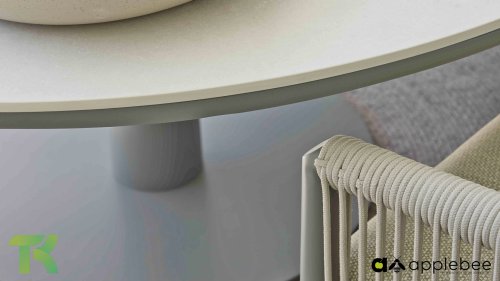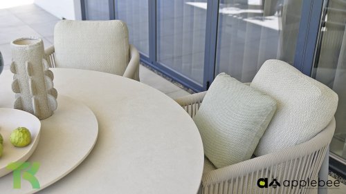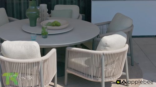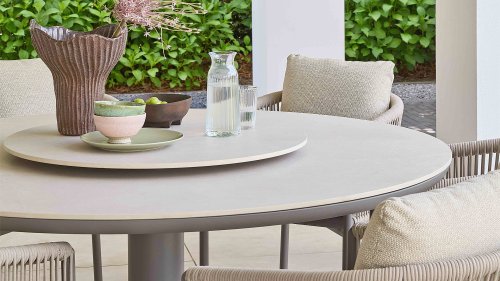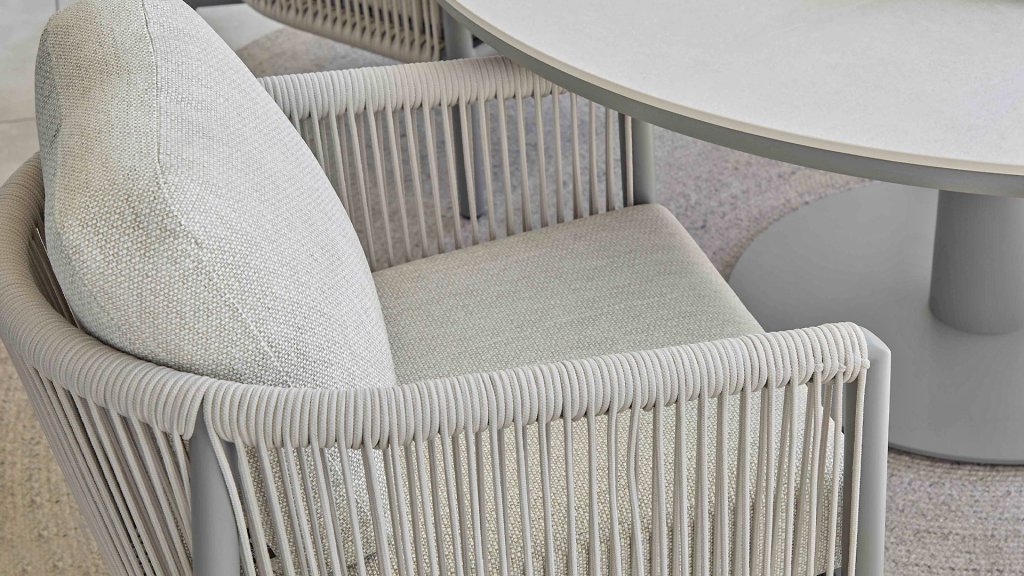 Die leicht geschwungene Form des Gestells bietet in Kombination mit den großzügig gepolsterten Kissen hervorragende Unterstützung für Rücken und Arme und ermöglicht stundenlanges, bequemes Sitzen. Der passende niedrige Esstisch rundet das Ensemble ab und ist aus taupefarbenem Aluminium mit einer Tischplatte aus weißer Travertin-Keramik gefertigt: pflegeleicht und dennoch hochwertig und elegant.