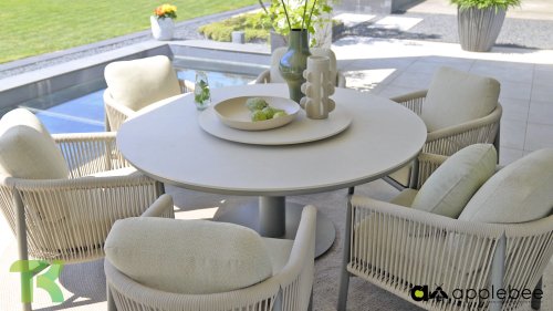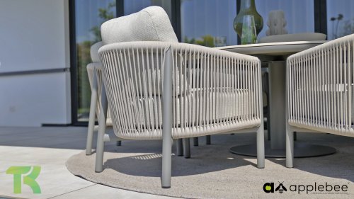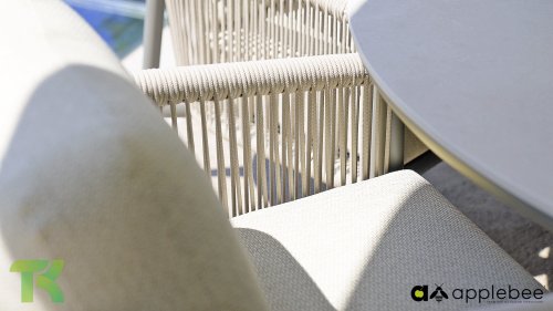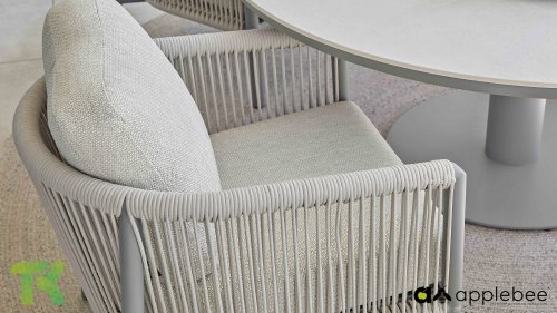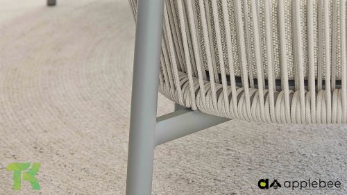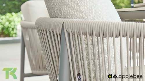 Für alle, die stilvoll speisen und entspannen möchten, ist das Bora Bora Low Dining Set genau das Richtige. Dieses Set vereint den Komfort einer Lounge-Garnitur mit der Funktionalität eines Esstisches – perfekt für lange Sommerabende im Garten. Das elegante, abgerundete Aluminiumrohrgestell ist in warmem Taupe pulverbeschichtet und verleiht dem Set eine sanfte, einladende Optik. Das zweilagige, geflochtene Seil aus Eiche sorgt für ein luftiges und modernes Ambiente, während die offene Struktur einen edlen, luxuriösen Look erzeugt.