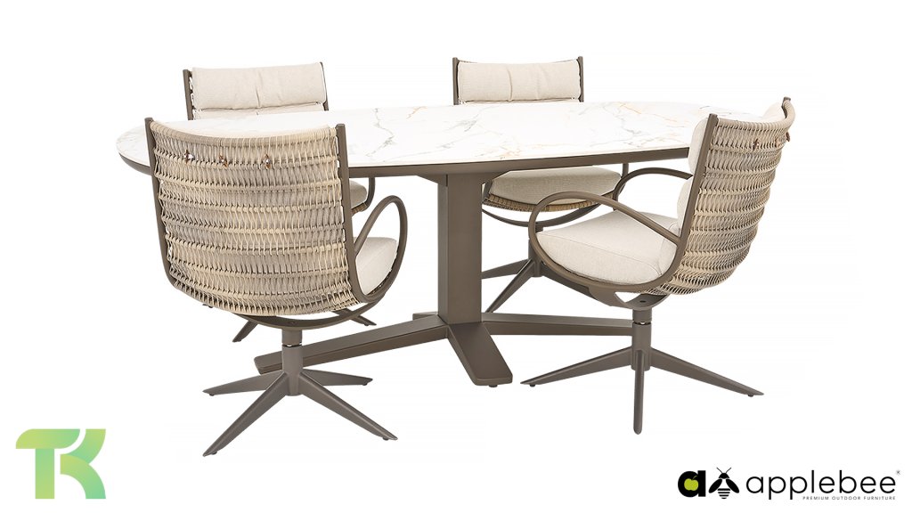 Verschönern Sie Ihren Außenbereich mit dem Gartentisch Zanzibar von Apple Bee – ein Paradebeispiel für modernes Design und wetterfeste Qualität. Dieser stilvolle Tisch besticht durch seine elegante, ovale Tischplatte (220x110cm) aus robustem Sinterstein, die auf einem schlanken, pulverbeschichteten Aluminiumgestell ruht. Die Kombination dieser Materialien garantiert eine lange Lebensdauer und macht den Tisch ideal für jede Jahreszeit.