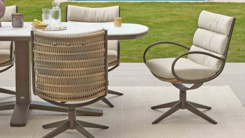 Die Esszimmerstühle sind drehbar. Das bedeutet, dass sich die Sitzfläche sanft drehen lässt, sodass Sie sich mühelos Ihrem Gesprächspartner oder der Sonne zuwenden können, ohne zu verrutschen. Die Essgruppe wird mit Kissen in der Farbe Nature geliefert. Dank der speziellen BeeWett-Technologie von Apple Bee sind diese Kissen feuchtigkeitsregulierend, trocknen schnell nach einem Regenschauer und sind UV-beständig. Die Camp Bay ist auch in der Farbe Oyster erhältlich.