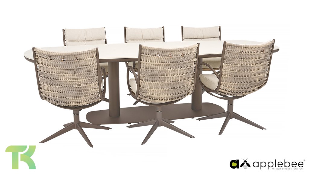 Die Esszimmerstühle sind drehbar. Das bedeutet, dass sich die Sitzfläche sanft drehen lässt, sodass Sie sich mühelos Ihrem Gesprächspartner oder der Sonne zuwenden können, ohne zu verrutschen. Die Essgruppe wird mit Kissen in der Farbe Nature geliefert. Dank der speziellen BeeWett-Technologie von Apple Bee sind diese Kissen feuchtigkeitsregulierend, trocknen schnell nach einem Regenschauer und sind UV-beständig. Die Camp Bay ist auch in der Farbe Oyster erhältlich.