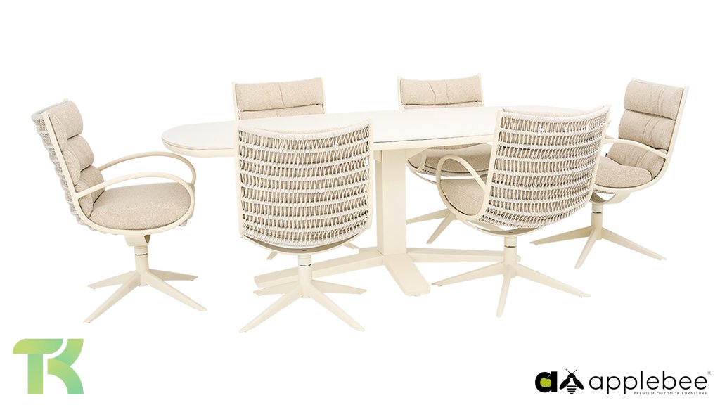 Die Esszimmerstühle sind drehbar. Das bedeutet, dass sich die Sitzfläche leicht drehen lässt, sodass Sie sich mühelos Ihrem Gesprächspartner oder der Sonne zuwenden können, ohne zu verrutschen. Die Gruppe ist mit Kissen in der warmen Farbe Cotton Flower ausgestattet. Dank der speziellen BeeWett-Technologie von Apple Bee sind diese Kissen feuchtigkeitsregulierend, trocknen schnell nach einem Regenschauer und sind UV-beständig. Die Camp Bay ist auch in Bronze erhältlich.