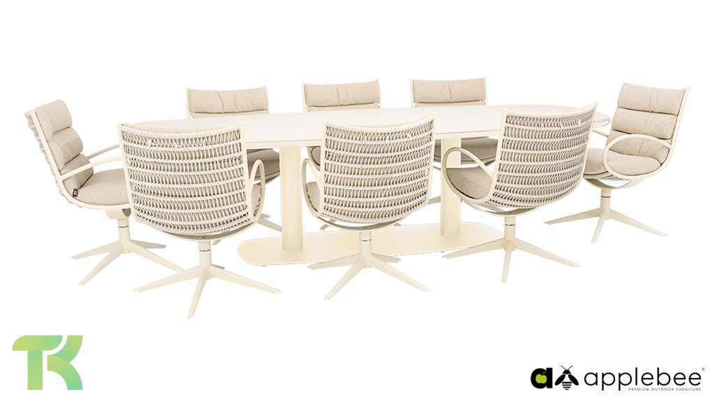 Die Esszimmerstühle sind drehbar. Das bedeutet, dass sich die Sitzfläche leicht drehen lässt, sodass Sie sich mühelos Ihrem Gesprächspartner oder der Sonne zuwenden können, ohne zu verrutschen. Die Gruppe ist mit Kissen in der warmen Farbe Cotton Flower ausgestattet. Dank der speziellen BeeWett-Technologie von Apple Bee sind diese Kissen feuchtigkeitsregulierend, trocknen schnell nach einem Regenschauer und sind UV-beständig. Die Camp Bay ist auch in Bronze erhältlich.