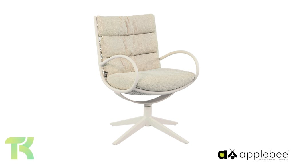 Die Esszimmerstühle sind drehbar. Das bedeutet, dass sich die Sitzfläche leicht drehen lässt, sodass Sie sich mühelos Ihrem Gesprächspartner oder der Sonne zuwenden können, ohne zu verrutschen. Die Gruppe ist mit Kissen in der warmen Farbe Cotton Flower ausgestattet. Dank der speziellen BeeWett-Technologie von Apple Bee sind diese Kissen feuchtigkeitsregulierend, trocknen schnell nach einem Regenschauer und sind UV-beständig. Die Camp Bay ist auch in Bronze erhältlich.