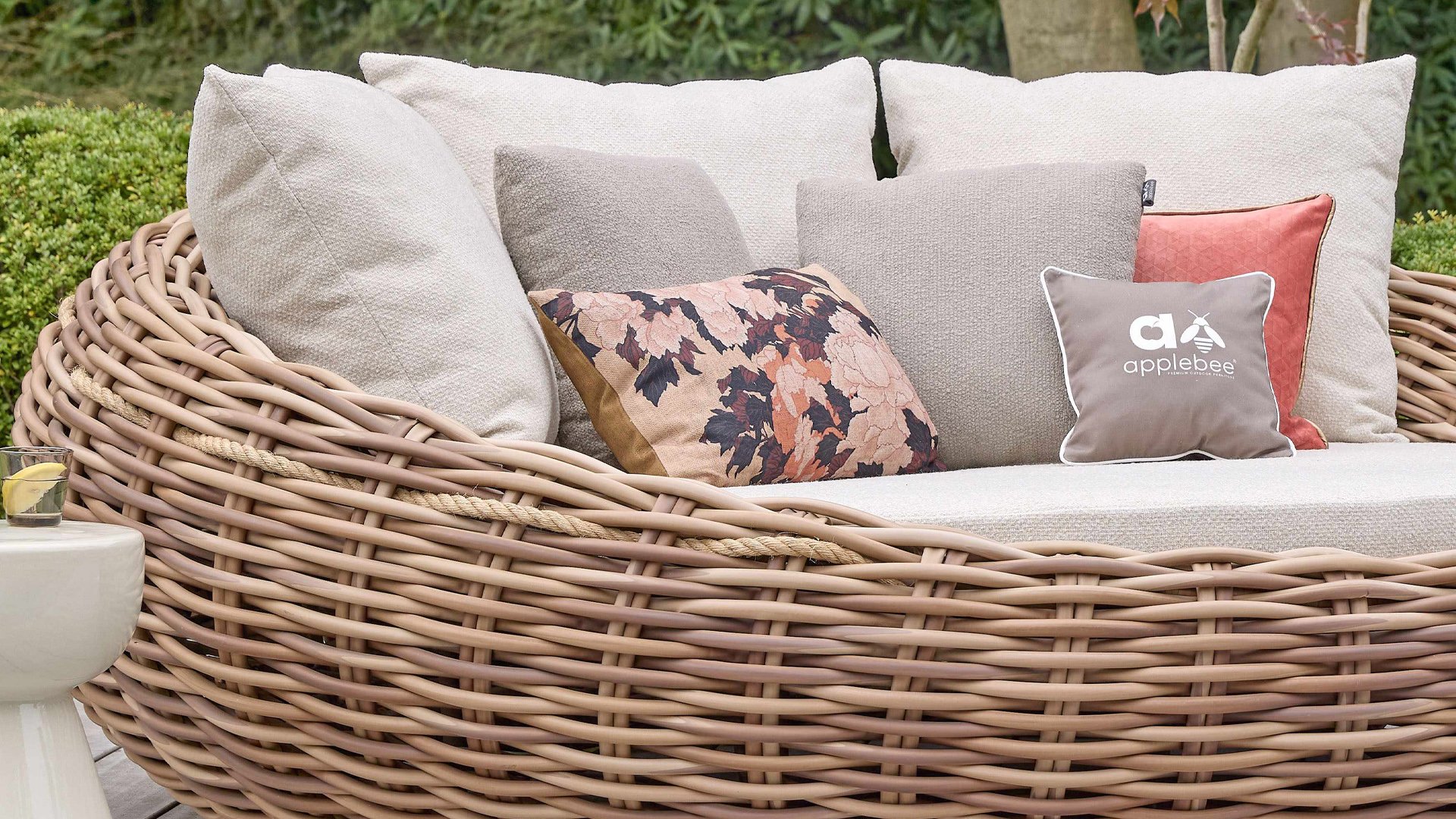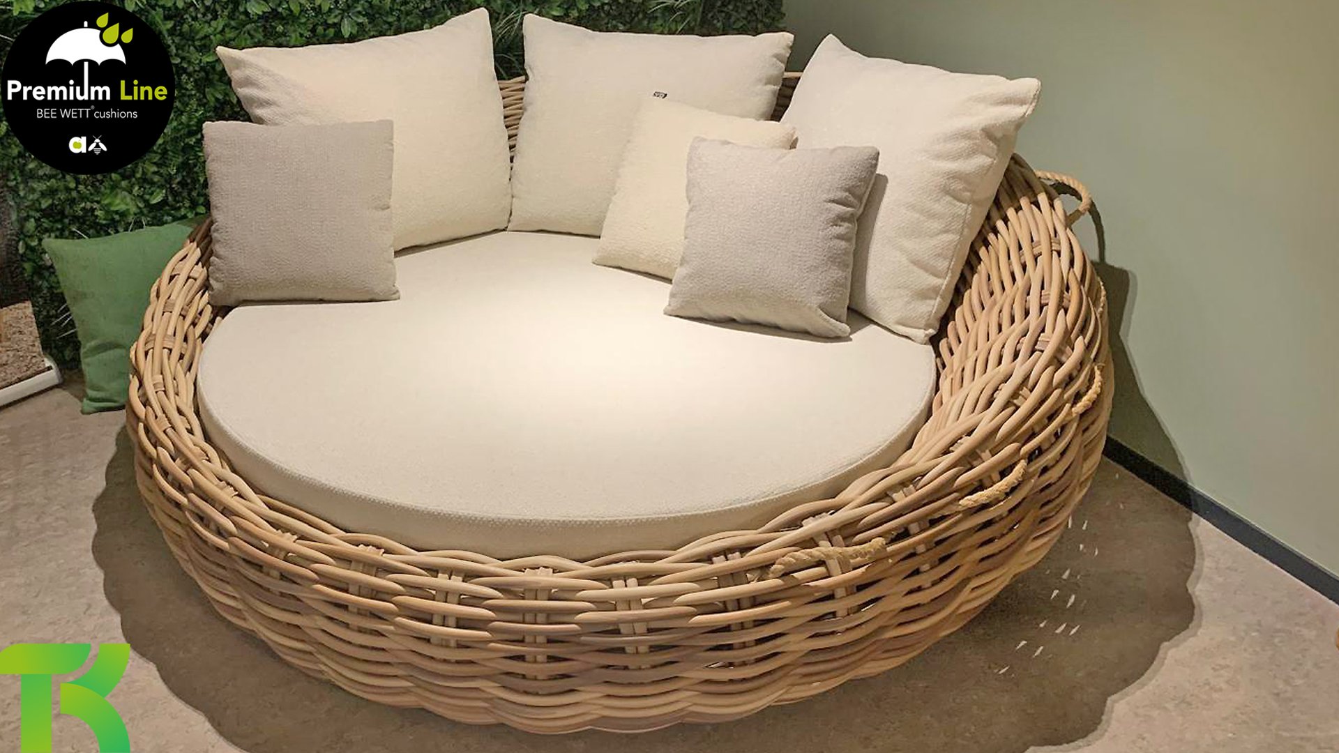 Apple Bee Cocoon Daybed; “Größer ist besser”. Das Cocoon Daybed hat einen beeindruckenden Durchmesser von stolzen 220 cm und ist mit schönen Loungekissen ausgestattet. Natürlich bietet die gigantische Größe ausreichend Platz für zwei Personen. Trotz seiner Größe ist das Daybed überraschend leicht zu bewegen, dank des mit Sisalseil geflochtenen Griffs.