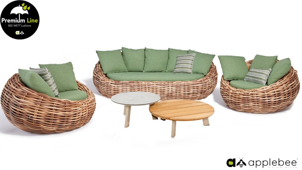 Applebee Cocoon ist inspiriert durch den sicheren Kokon, in dem sich eine Raupe geborgen fühlt und sich in einen wunderschönen Schmetterling verwandelt. Wunderschöne grüne Loungekissen – optional mit Bee-Wett®-Technologie – in Kombination mit dem außergewöhnlich dicken geflochtenen Biculair®-Flechtfaden in 20mm Stärke.