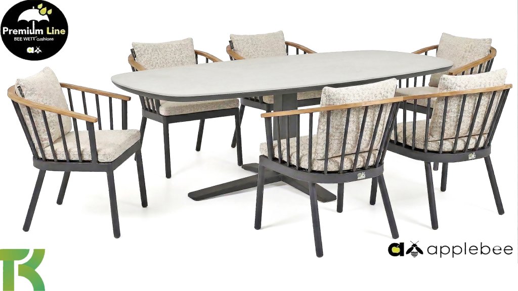 Verschönern Sie Ihren Außenbereich mit dem Gartentisch Zanzibar von Apple Bee – ein Paradebeispiel für modernes Design und wetterfeste Qualität. Dieser stilvolle Tisch besticht durch seine elegante, ovale Tischplatte (220x110cm) aus robustem Sinterstein, die auf einem schlanken, pulverbeschichteten Aluminiumgestell ruht. Die Kombination dieser Materialien garantiert eine lange Lebensdauer und macht den Tisch ideal für jede Jahreszeit.