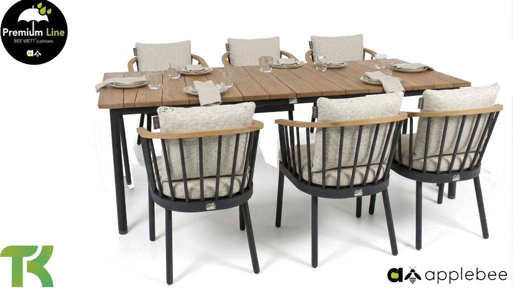 Die Apple Bee Condor Dining Black besticht durch ihr elegantes und robustes Design. Dies spiegelt sich sowohl im Stuhl als auch im Tischgestell wider. Das Gestell besteht aus mattschwarz pulverbeschichtetem Aluminium und zeichnet sich durch seine Stabilität aus. Die BEE WETT® Kissen sind grob gewebt und bieten dennoch ein weiches, bequemes Sitzgefühl. Zusammen mit den formschönen Kurven der Stuhllehne und der Verwendung von natürlichem Teakholz für Tischplatte und Armlehnen verströmt die Condor Essgruppe eine angenehme, natürliche Wärme.