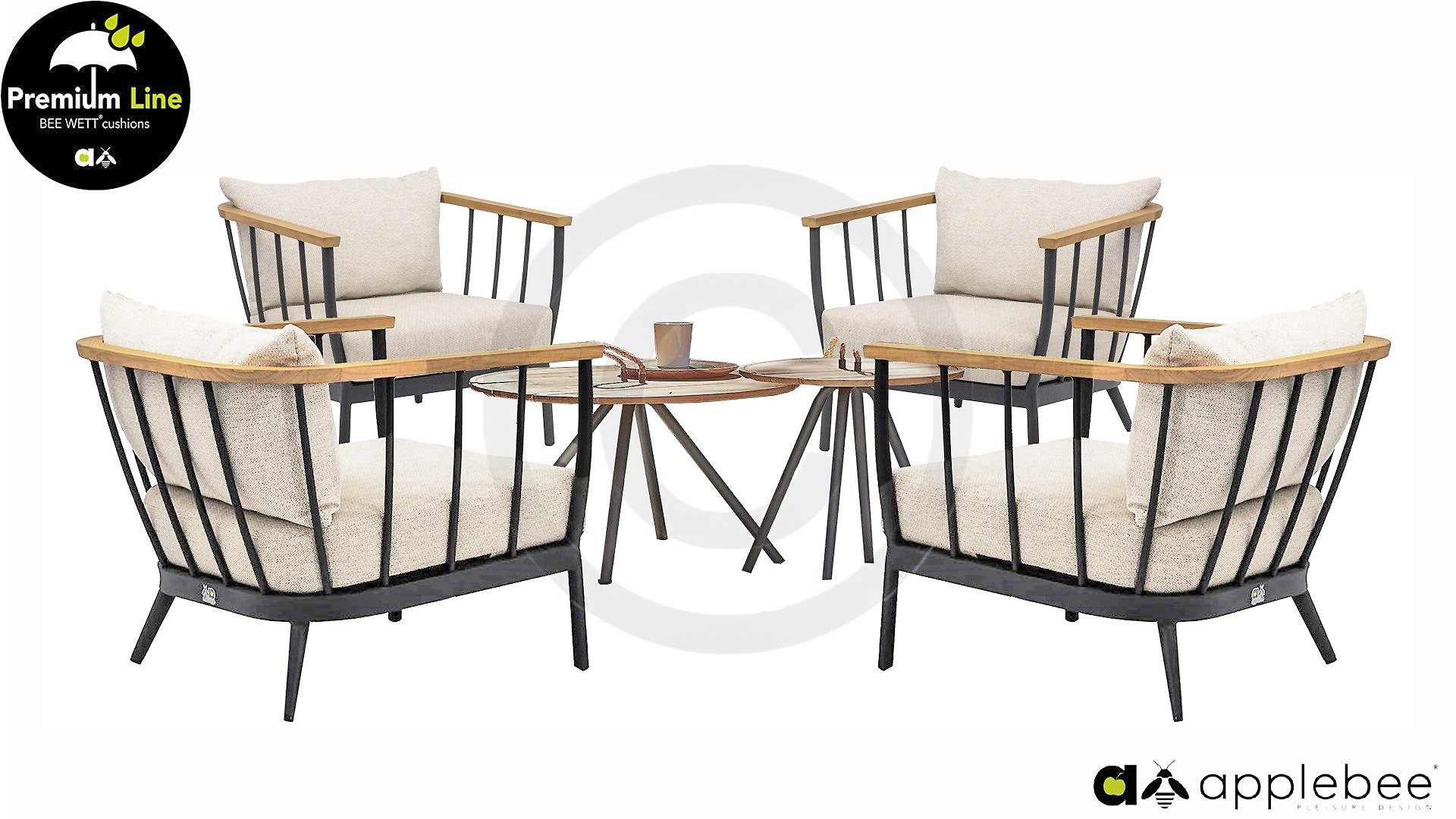 Die Apple Bee Condor Lounge Black ein klares, robustes Aussehen. Das Grundmaterial besteht aus pulverbeschichtetem matt-schwarzem Aluminium. Die BEE WETT® Kissen haben eine grobe Webstruktur, aber mit einem weichen Griff. Die schönen Rundungen im Rücken und der Einsatz von naturbelassenem Teakholz in den Armlehnen verleihen dem Condor eine angenehme natürliche Wärme.