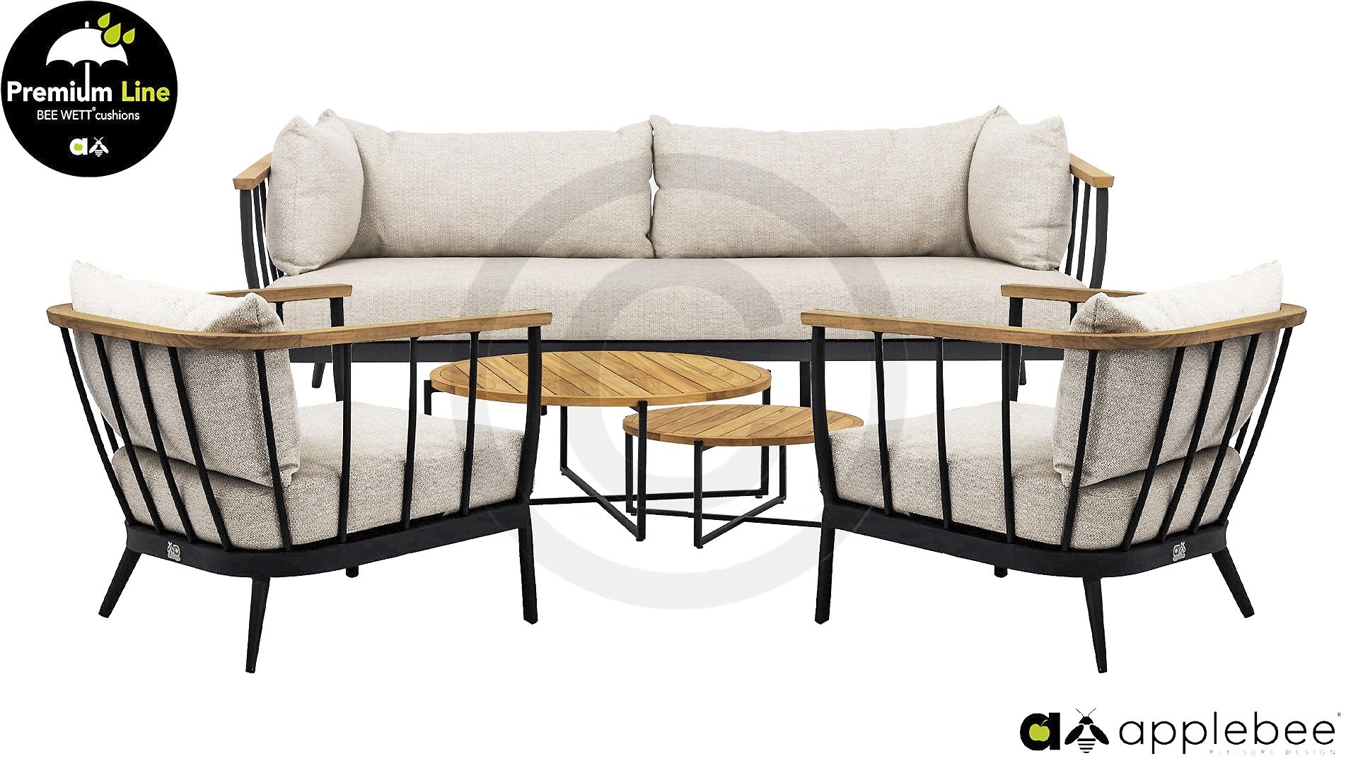 Die Apple Bee Condor Lounge Black ein klares, robustes Aussehen. Das Grundmaterial besteht aus pulverbeschichtetem matt-schwarzem Aluminium. Die BEE WETT® Kissen haben eine grobe Webstruktur, aber mit einem weichen Griff. Die schönen Rundungen im Rücken und der Einsatz von naturbelassenem Teakholz in den Armlehnen verleihen dem Condor eine angenehme natürliche Wärme.