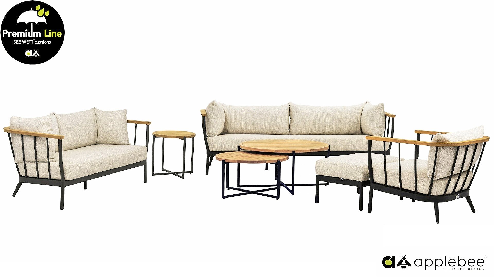 Die Apple Bee Condor Lounge Black ein klares, robustes Aussehen. Das Grundmaterial besteht aus pulverbeschichtetem matt-schwarzem Aluminium. Die BEE WETT® Kissen haben eine grobe Webstruktur, aber mit einem weichen Griff. Die schönen Rundungen im Rücken und der Einsatz von naturbelassenem Teakholz in den Armlehnen verleihen dem Condor eine angenehme natürliche Wärme.