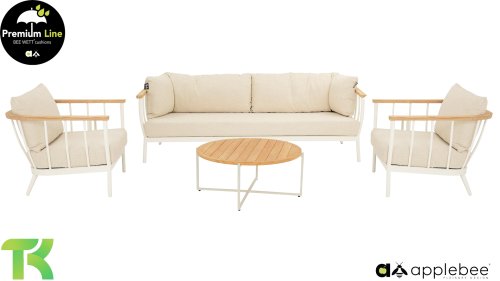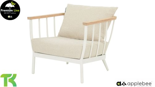 Die Apple Bee Condor Lounge Oyster hat ein klares, robustes Aussehen. Das Basismaterial ist Oyster-farbenes pulverbeschichtetes Aluminium. Die BEE WETT® Kissen haben eine grobe Webstruktur, aber mit einem weichen Griff. Die schönen Rundungen im Rücken und die Verwendung von naturbelassenem Teakholz in den Armlehnen verleihen dem Condor eine angenehme Prise natürliche Wärme.