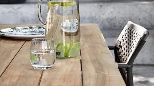 Drei verschiedene Materialien wurden kombiniert, um diesem Set sein schönes, elegantes Aussehen zu verleihen. So sind zum Beispiel die Tischplatte des Esstisches und die Armlehnen der Esszimmerstühle aus Teakholz gefertigt, das sich sehr schön mit dem Schwarz in diesem Set färbt. Der runde, mattschwarze Aluminiumrohrrahmen wechselt sich mit einer Armlehne aus natürlichem Teakholz ab. Das Gestell sowohl des Tisches als auch der Stühle besteht aus mattschwarzem Aluminium. Zur Vervollständigung der Apple Bee Elle-Kollektion wurde auf der Rückseite eine geflochtene schwarze Glocke hinzugefügt, die dem Elle-‚Gürtel‘ auch seinen Namen gibt. Wir nennen dieses Geflecht ‚Belt & Rope‘.