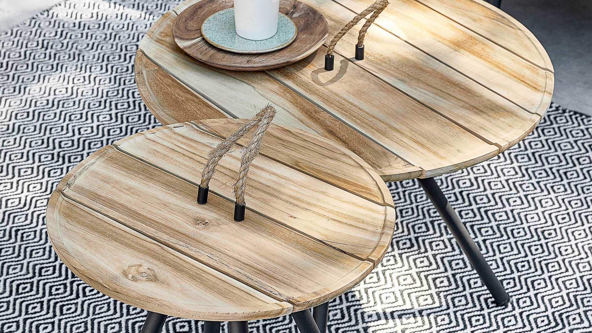 Diese Elle Apple Bee Kaffeetische lassen sich super einfach kombinieren, da sie aus Holz und Aluminium gefertigt sind. Durch die schöne natürliche Farbe in Kombination mit dem mattschwarzen Rahmen hat dieser Tisch ein schlichtes, aber dennoch freundliches Aussehen. Dieses nette Set besteht aus einem 40 Zentimeter hohen Tisch mit einem Durchmesser von 60 Zentimetern und einem 45 Zentimeter hohen Tisch mit einem Durchmesser von 40 Zentimetern.