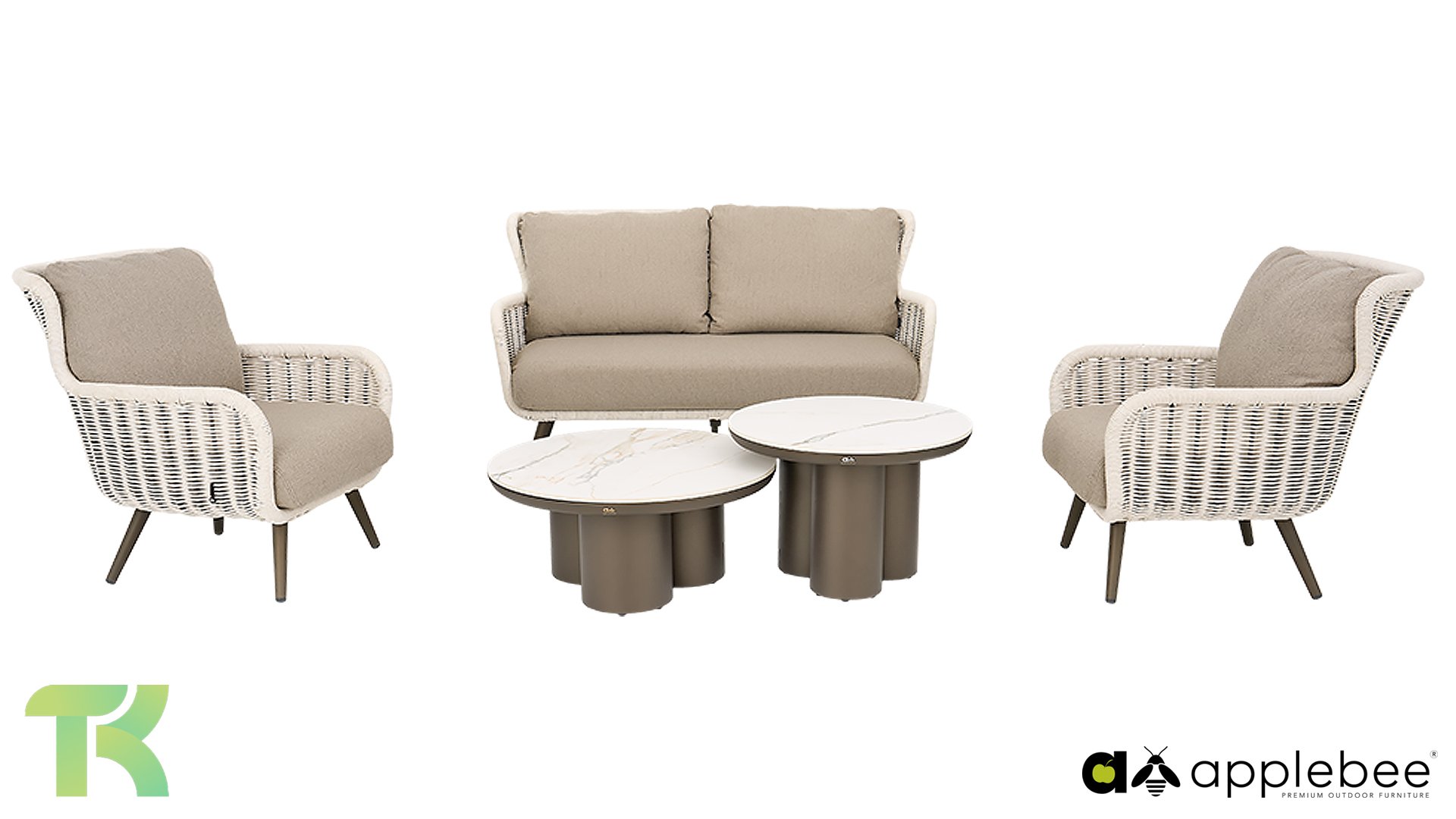 Raffiniertes Design mit Charakter. Die Apple Bee Key Largo Lounge besticht durch ihre wunderschönen Kontraste. Das pulverbeschichtete Aluminiumgestell in elegantem Bronze bildet eine stabile und zugleich elegante Basis. Dazu passt das edle Biculair®-Geflecht in Elfenbein. Der Biculair®-Draht ist in einer einzigen, nahtlosen, geschwungenen Linie bis zur Sitzfläche geflochten. Dieses Geflecht, das an luxuriöses Seil erinnert, verleiht dem Set einen rustikalen, bohemischen Charme, der in jedem Garten eine gute Figur macht.