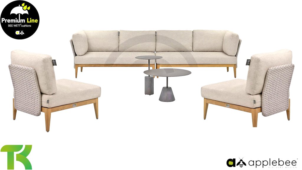 Apple Bee Lisa Teak Lounge: Eleganz in ihrer reinsten Form! Sanfte Linien, subtile Details und auffällige Kontraste. Ein naturbelassenes SVLK Teakholzgestell mit leicht konisch zulaufenden, abgerundeten Beinen verleiht dem Set eine raffinierte Basis. Lisa hat auch eine robuste Seite; Das straff geflochtene Sunproof Band verleiht der Lehne eine schöne Struktur. Zu jeder Tageszeit wirkt es anders, je nachdem, wie das Sonnenlicht das Geflecht beleuchtet. Weiche und bequeme Kissen, natürlich in Apple Bee's Bee Wett Qualität, runden das Bild ab. Hier können Sie stundenlang träumen!