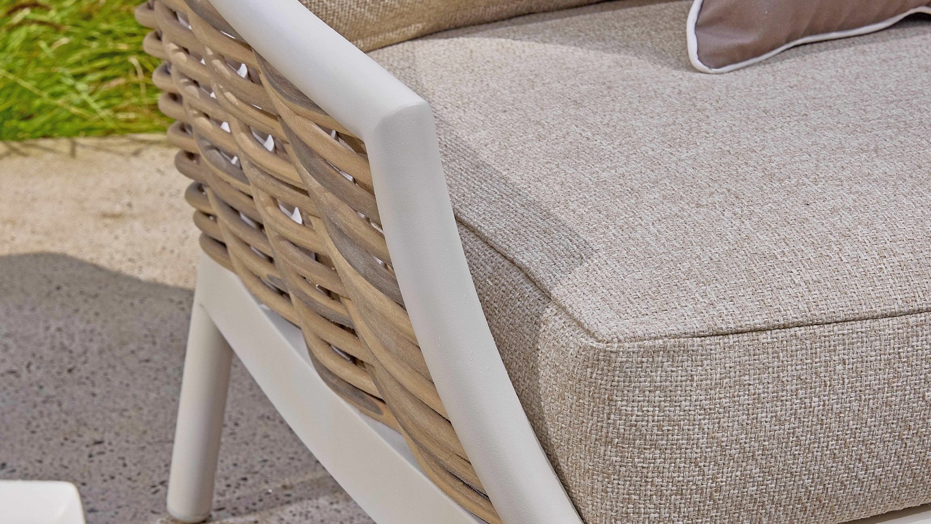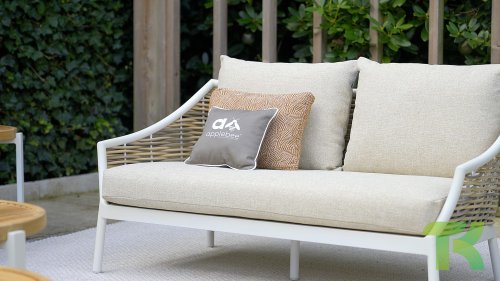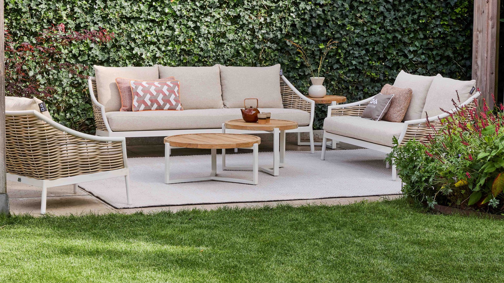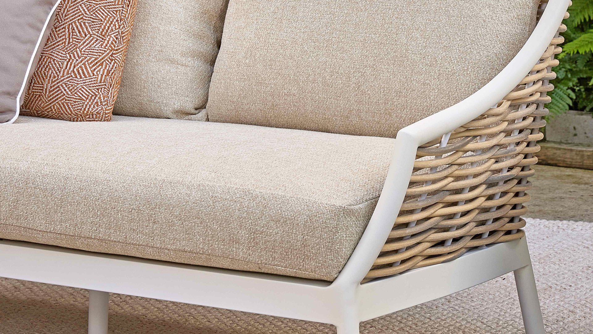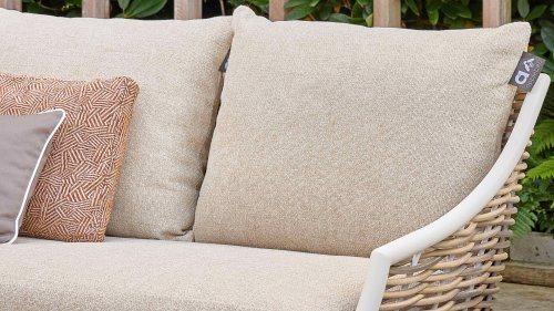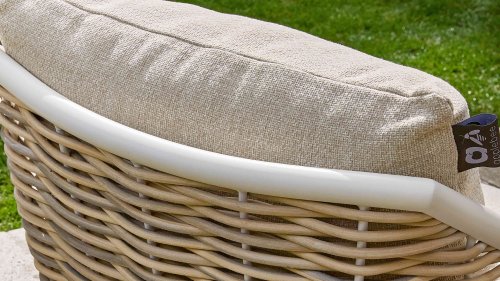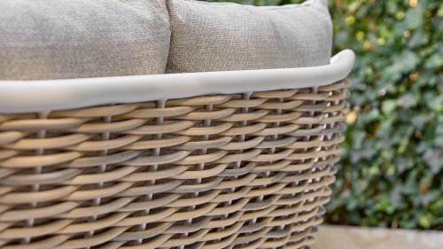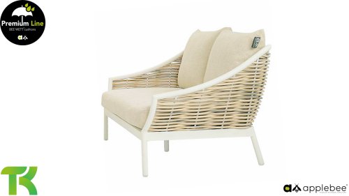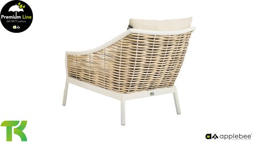 Die Apple Bee Milou Lounge Oyster besticht durch ihre elegante Flechtoptik und verleiht Ihrer Lounge-Garnitur eine natürliche Note! Sie bietet großzügigen Sitzkomfort und dicke Kissen mit Apple Bees bewährter Bee Wett®-Technologie. Das Gestell besteht aus pulverbeschichtetem Aluminium in Austernfarbe, kombiniert mit robustem Biculair-Flechtgeflecht. Dieses Flechtgeflecht wird von einem ebenfalls pulverbeschichteten Rahmen in Austernfarbe mit geschwungenen Linien eingefasst, was der Milou ihren schicken, modernen Look verleiht.
