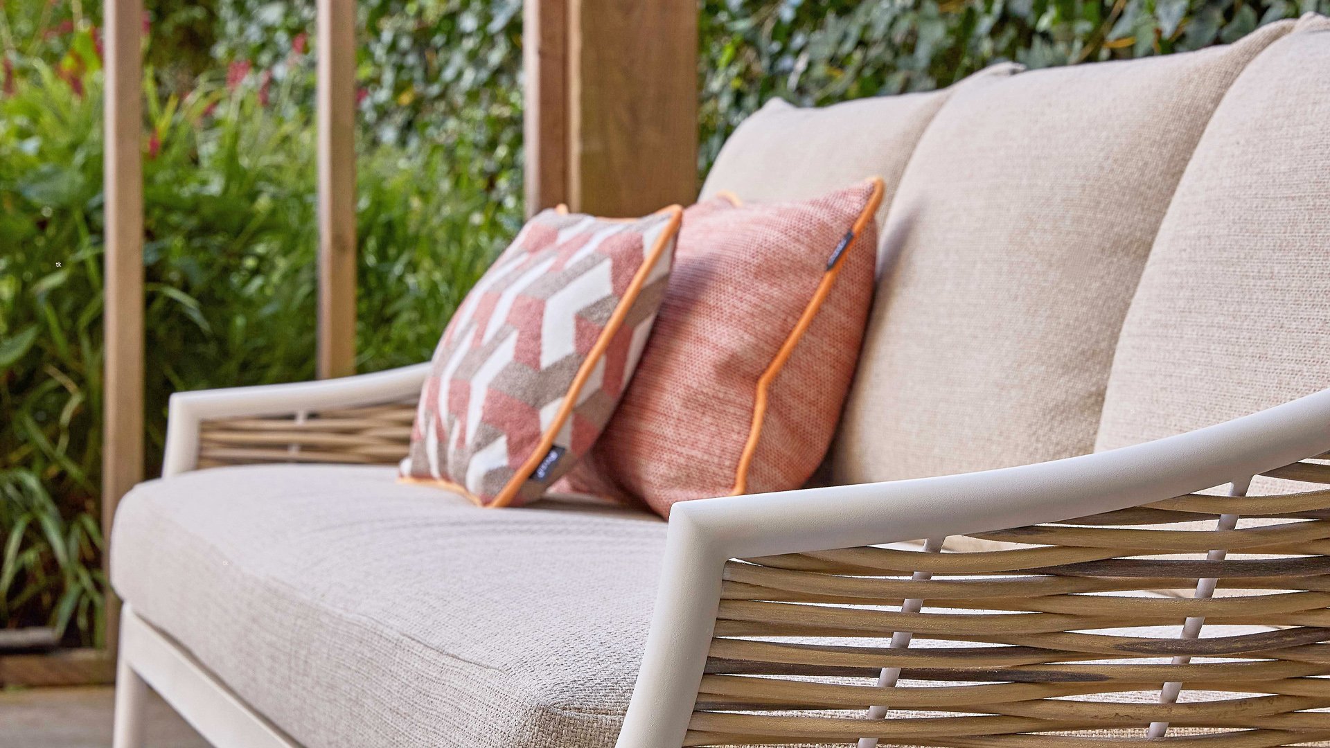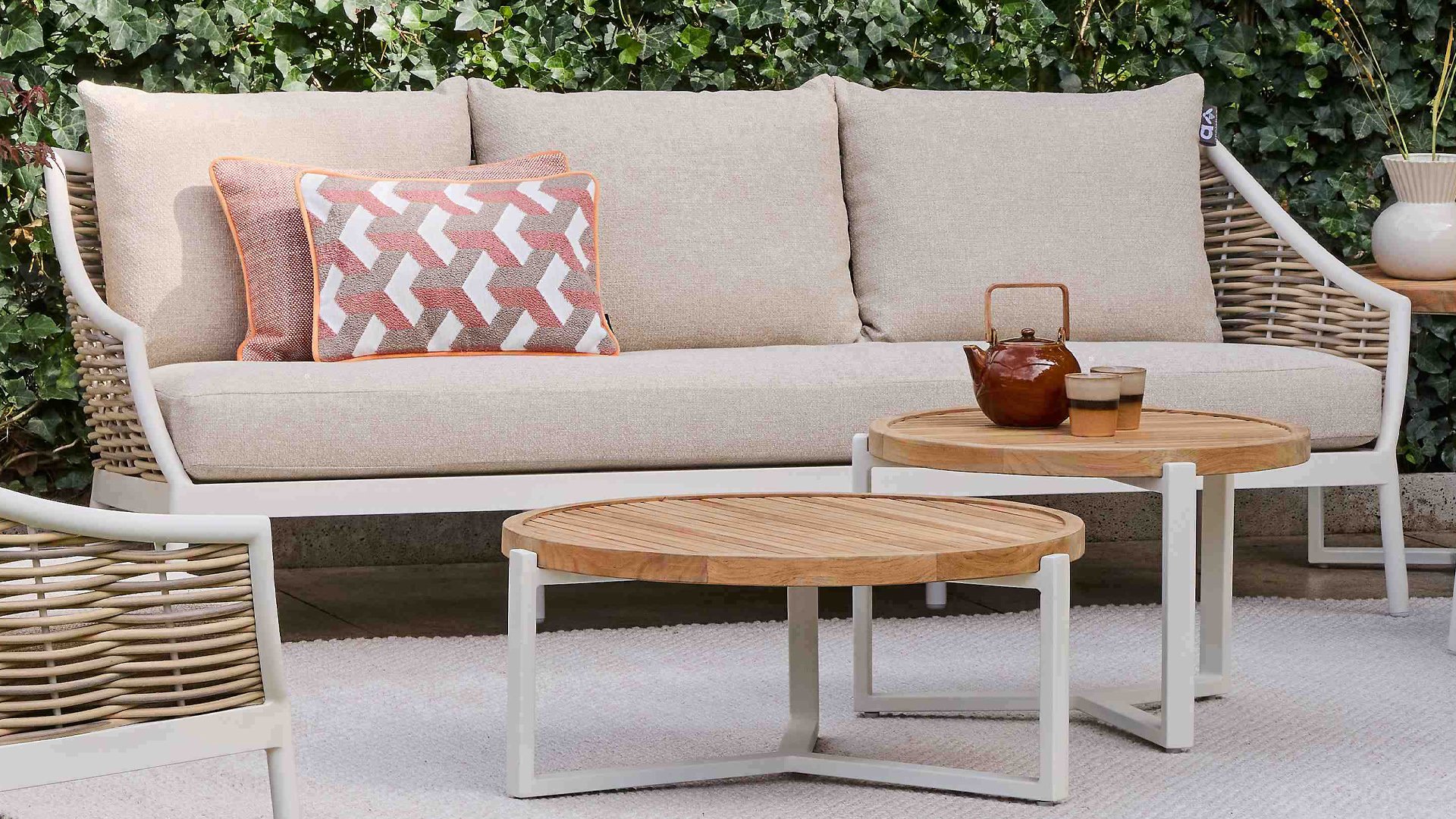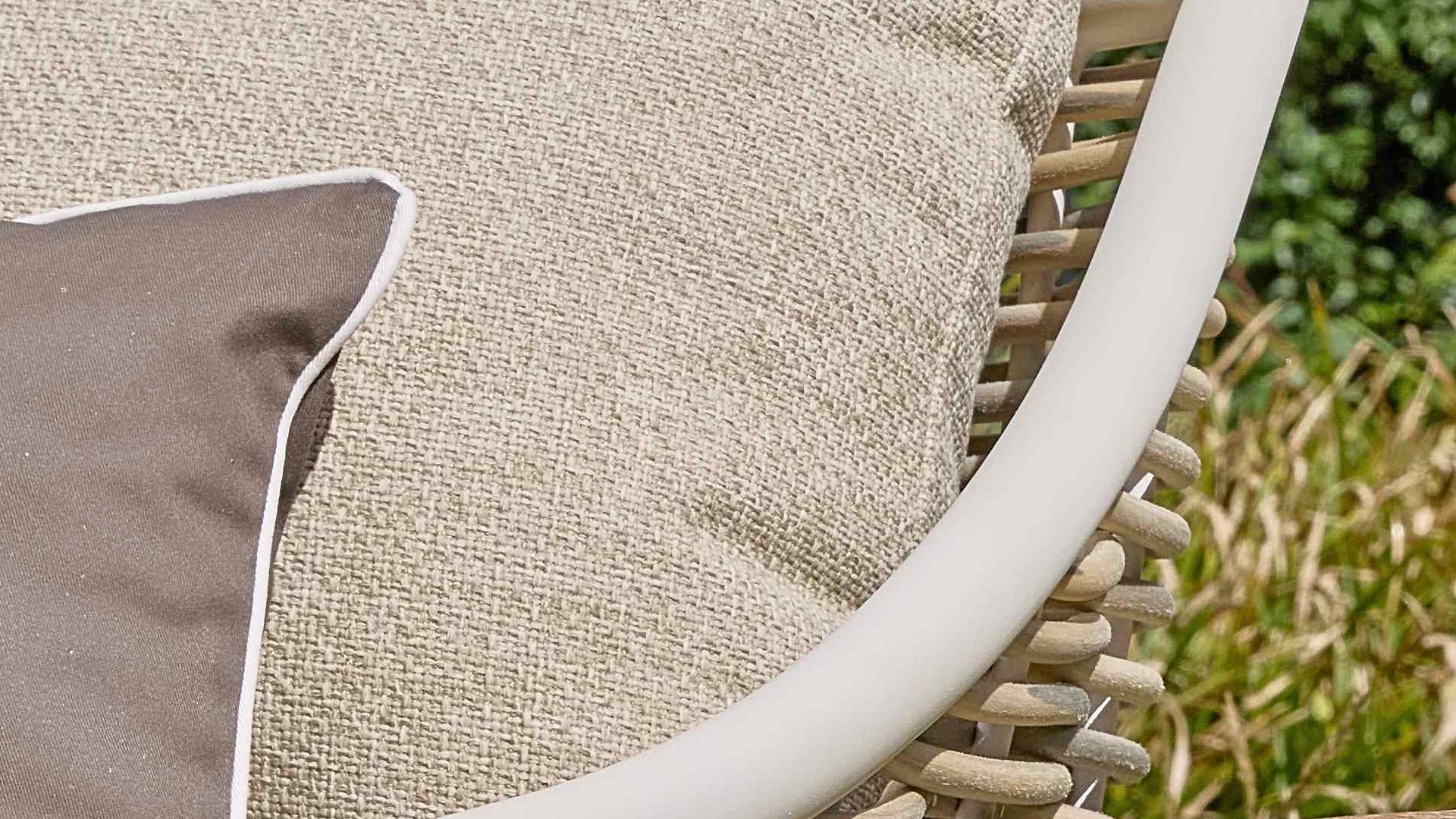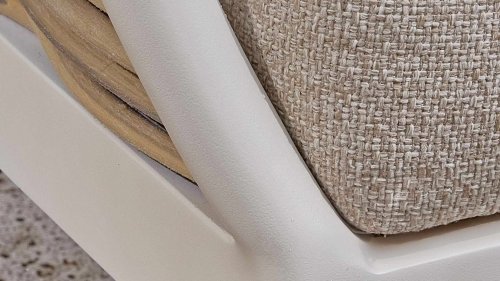 Die Apple Bee Milou Lounge Oyster besticht durch ihre elegante Flechtoptik und verleiht Ihrer Lounge-Garnitur eine natürliche Note! Sie bietet großzügigen Sitzkomfort und dicke Kissen mit Apple Bees bewährter Bee Wett®-Technologie. Das Gestell besteht aus pulverbeschichtetem Aluminium in Austernfarbe, kombiniert mit robustem Biculair-Flechtgeflecht. Dieses Flechtgeflecht wird von einem ebenfalls pulverbeschichteten Rahmen in Austernfarbe mit geschwungenen Linien eingefasst, was der Milou ihren schicken, modernen Look verleiht.