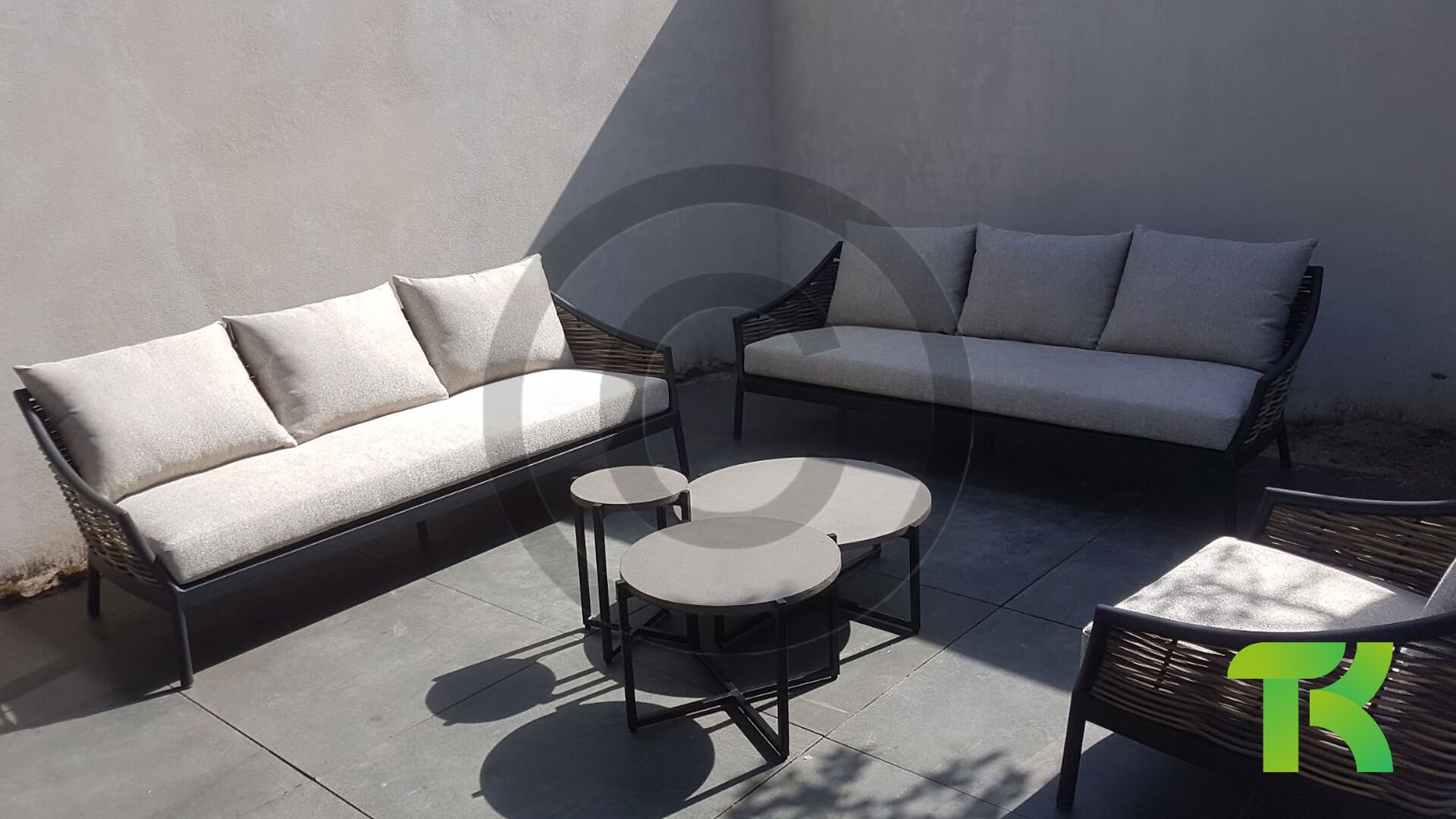 | Materialien Lounge-Sofas | Pulverbeschichtet Aluminium/Stahl, Geflecht |
