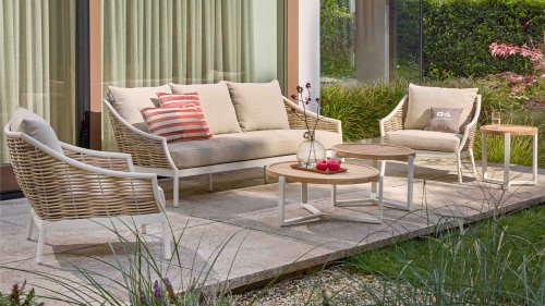 Der Mädchenname Milou bedeutet sanft und freundlich. Das trifft auf das neue Schmuckstück der Apple Bee Kollektion perfekt zu. Das Flechtwerk der Apple Bee Milou erinnert an Weide. Es wirkt natürlich und bietet gleichzeitig die gewohnte, robuste Biculair®-Qualität für den Außenbereich, die Sie von Apple Bee kennen. Das Flechtwerk wird von einem Oyster, pulverbeschichteten Rahmen mit geschwungenen Linien eingefasst, der dem Milou Gartenmöbelset seinen schicken, modernen Look verleiht.