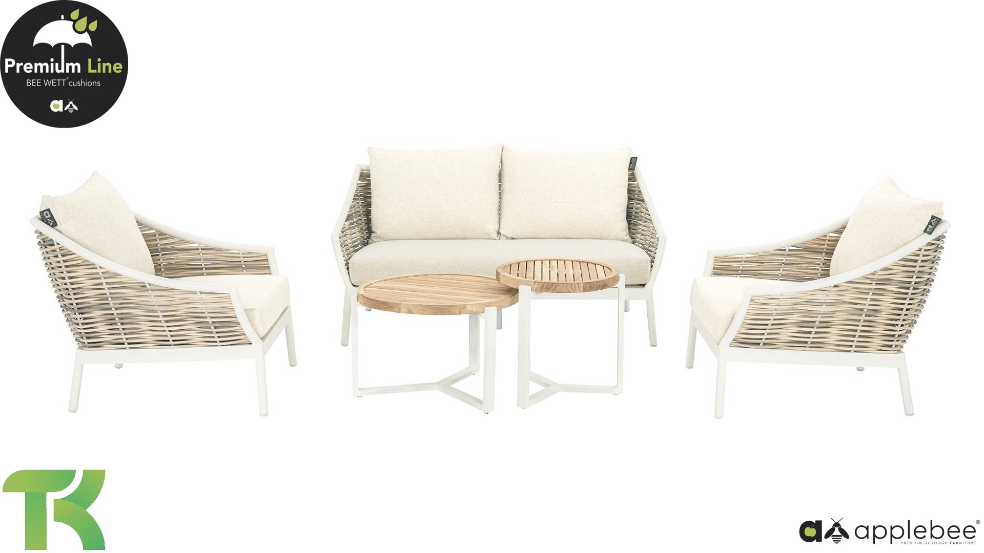 Die Apple Bee Milou Lounge Oyster besticht durch ihre elegante Flechtoptik und verleiht Ihrer Lounge-Garnitur eine natürliche Note! Sie bietet großzügigen Sitzkomfort und dicke Kissen mit Apple Bees bewährter Bee Wett®-Technologie. Das Gestell besteht aus pulverbeschichtetem Aluminium in Austernfarbe, kombiniert mit robustem Biculair-Flechtgeflecht. Dieses Flechtgeflecht wird von einem ebenfalls pulverbeschichteten Rahmen in Austernfarbe mit geschwungenen Linien eingefasst, was der Milou ihren schicken, modernen Look verleiht.