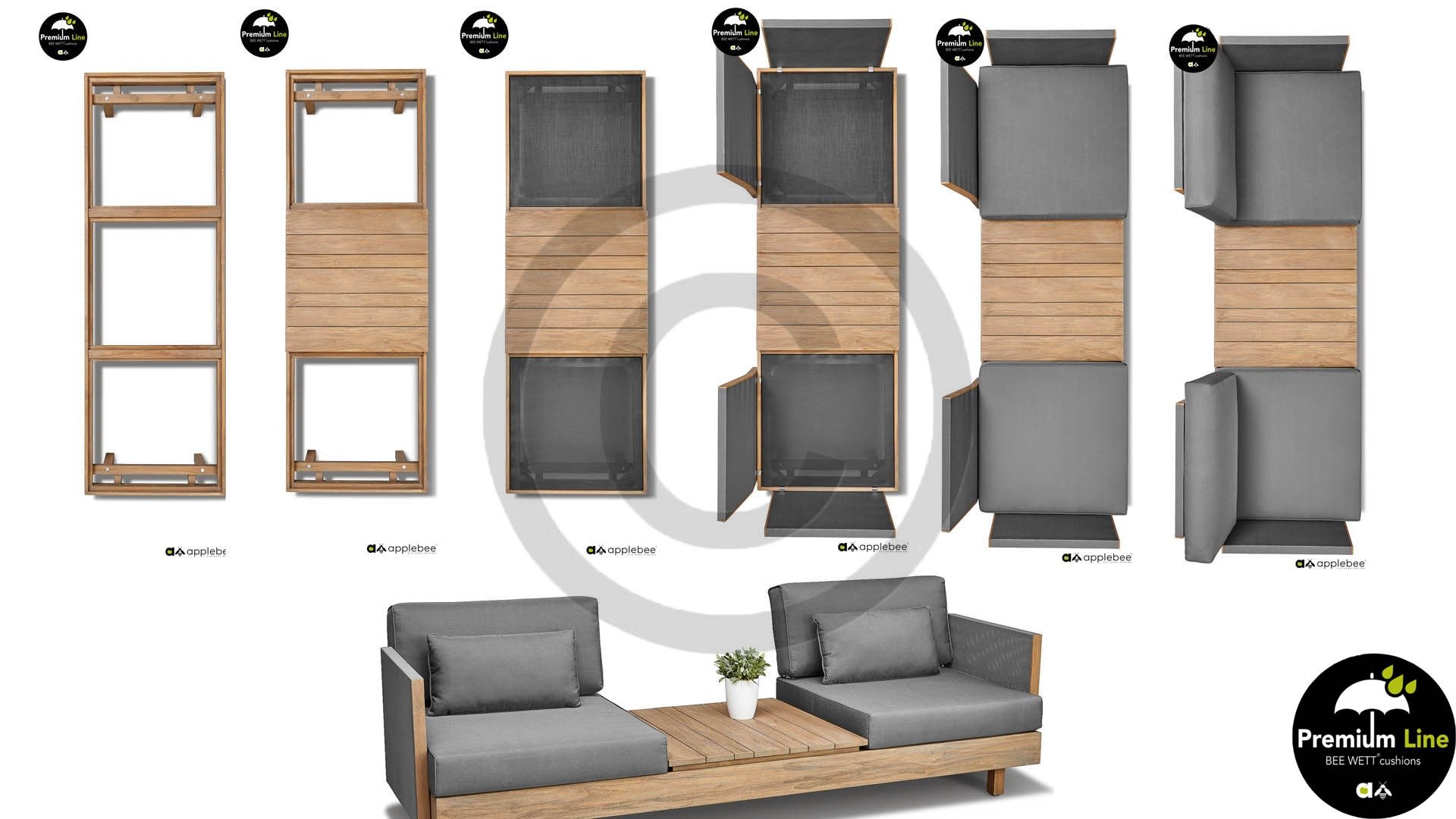 Das Applebee Lounge-Set Module X besteht aus extrem starkem Teakholz, das mit einem sogenannten neuen Antique Finish versehen ist, das Ihren Möbeln ein robustus Aussehen verleiht. Die Sitz- und Rückenkissen in dieser Reihe ist mit der BEE WETT®-Technologie, die perfekte Ableitung von Feuchtigkeit gewährleistet.