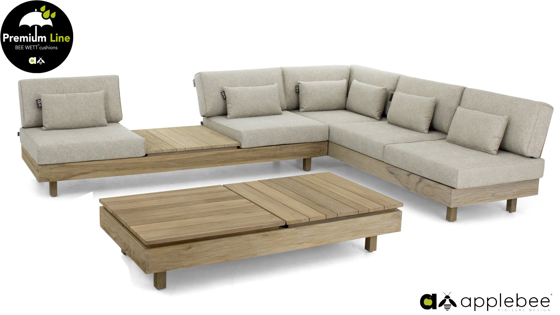 Das Applebee Lounge-Set Module X besteht aus extrem starkem Teakholz, das mit einem sogenannten neuen Coastal Finish versehen ist, das Ihren Möbeln ein frisches Aussehen verleiht. Die Sitz- und Rückenkissen in dieser Reihe ist mit der BEE WETT®-Technologie, die perfekte Ableitung von Feuchtigkeit gewährleistet.