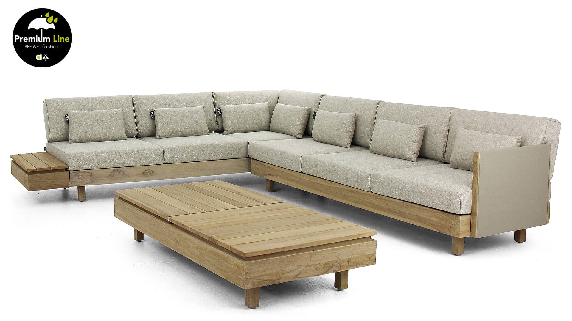 Das Applebee Lounge-Set Module X besteht aus extrem starkem Teakholz, das mit einem sogenannten neuen Coastal Finish versehen ist, das Ihren Möbeln ein frisches Aussehen verleiht. Die Sitz- und Rückenkissen in dieser Reihe ist mit der BEE WETT®-Technologie, die perfekte Ableitung von Feuchtigkeit gewährleistet.