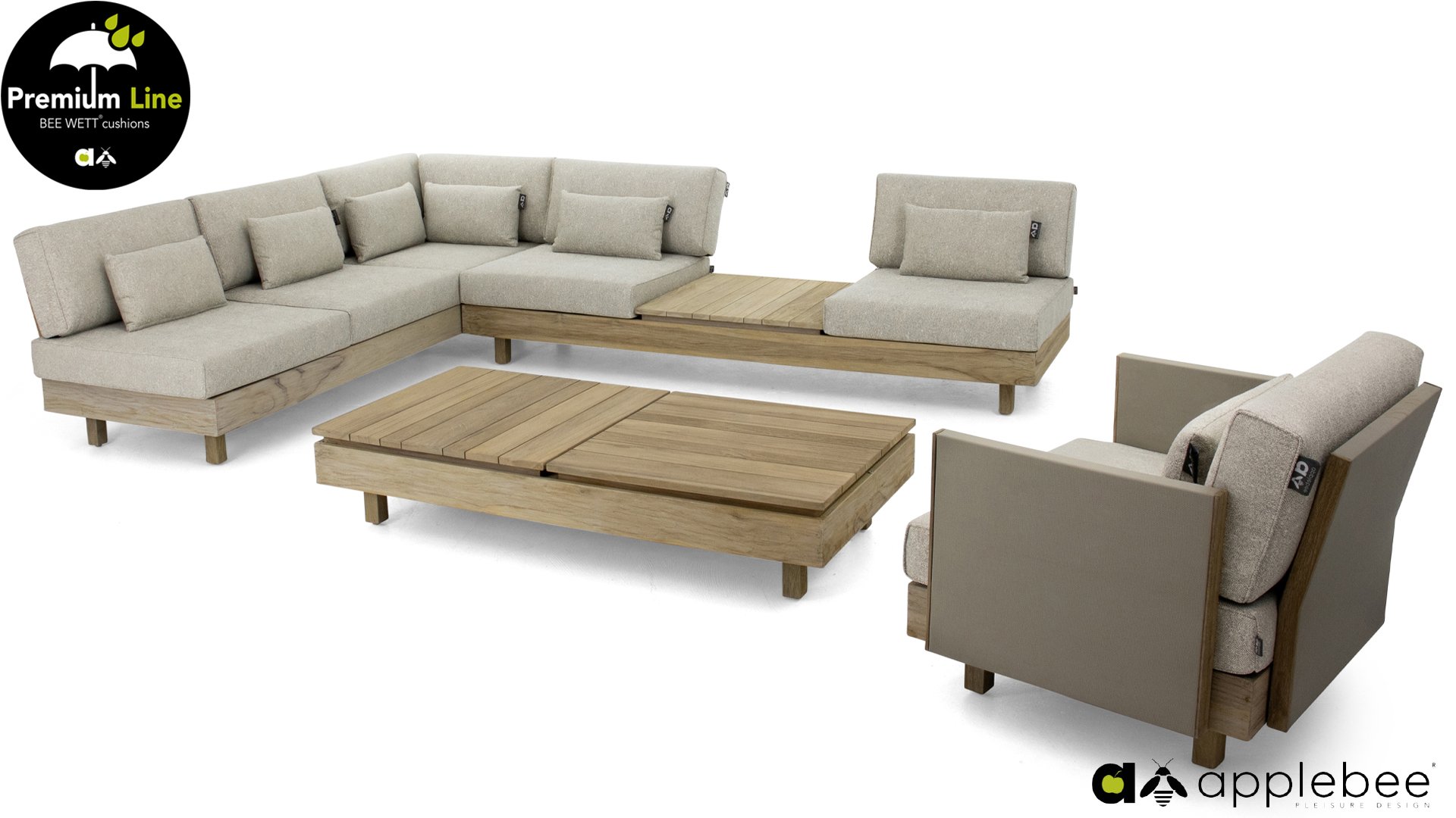Das Applebee Lounge-Set Module X besteht aus extrem starkem Teakholz, das mit einem sogenannten neuen Coastal Finish versehen ist, das Ihren Möbeln ein frisches Aussehen verleiht. Die Sitz- und Rückenkissen in dieser Reihe ist mit der BEE WETT®-Technologie, die perfekte Ableitung von Feuchtigkeit gewährleistet.