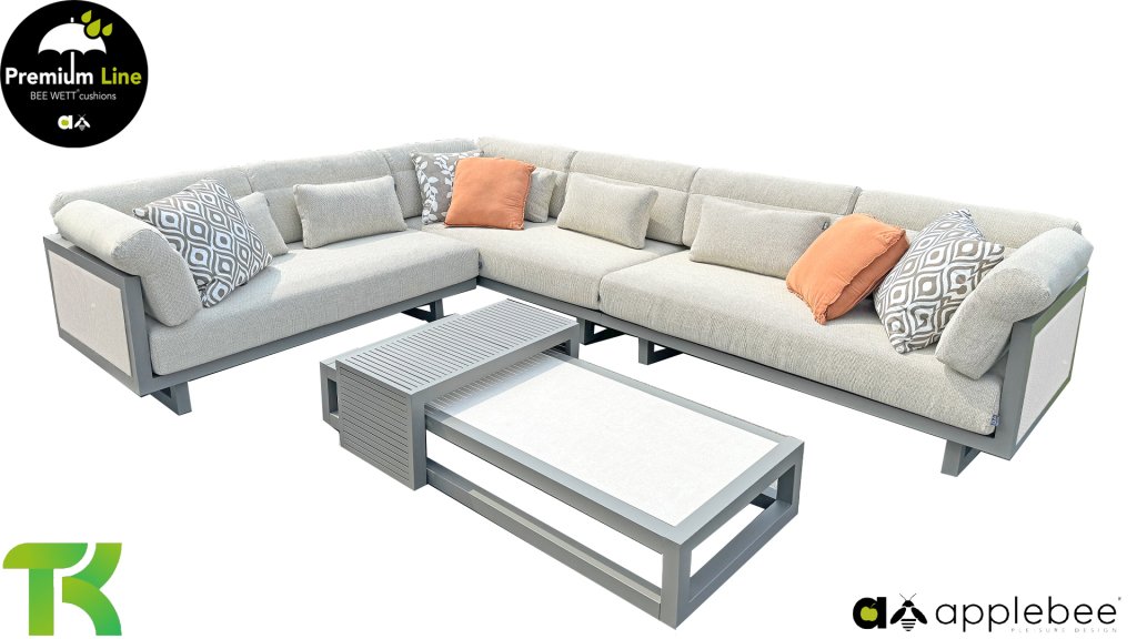 Apple Bee Santorini Lounge: Wenn Sie ein straffes und kubistisches Lounge-Set mögen, aber nicht auf Eigenwilligkeit verzichten möchten... hier ist Santorini! Ein straffes, Aluminium-Vierkantrohrgestell, pulverbeschichtet in warmem Taupe. Dieses Set ist in zwei Ausführungen erhältlich. Der Unterschied liegt in den Paneelen in den Armlehnen und der Rückenlehne, die durch den Rahmen wie ein Gemälde umrahmt wirken. In der ersten Ausführung ist das Paneel mit wunderschön meliertem Seil umwickelt. Dadurch behält das Set Leichtigkeit mit einem zeitgemäßen Look. Die andere Ausführung hat gepolsterte Paneelen im selben Stoff wie die Kissen. Dadurch erhält das Set sofort mehr Klasse und Luxus.