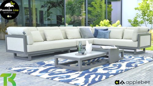 Die Apple Bee Santorini Kaffeetisch-Gruppe, dessen Basis aus Aluminium in der Farbe Quarz besteht. Die Platte des 155 cm langen Tisches ist aus Keramik in der Farbe Travetino. Eine elegante Kombination, besonders mit dem AppleBee Santorini Lounge!