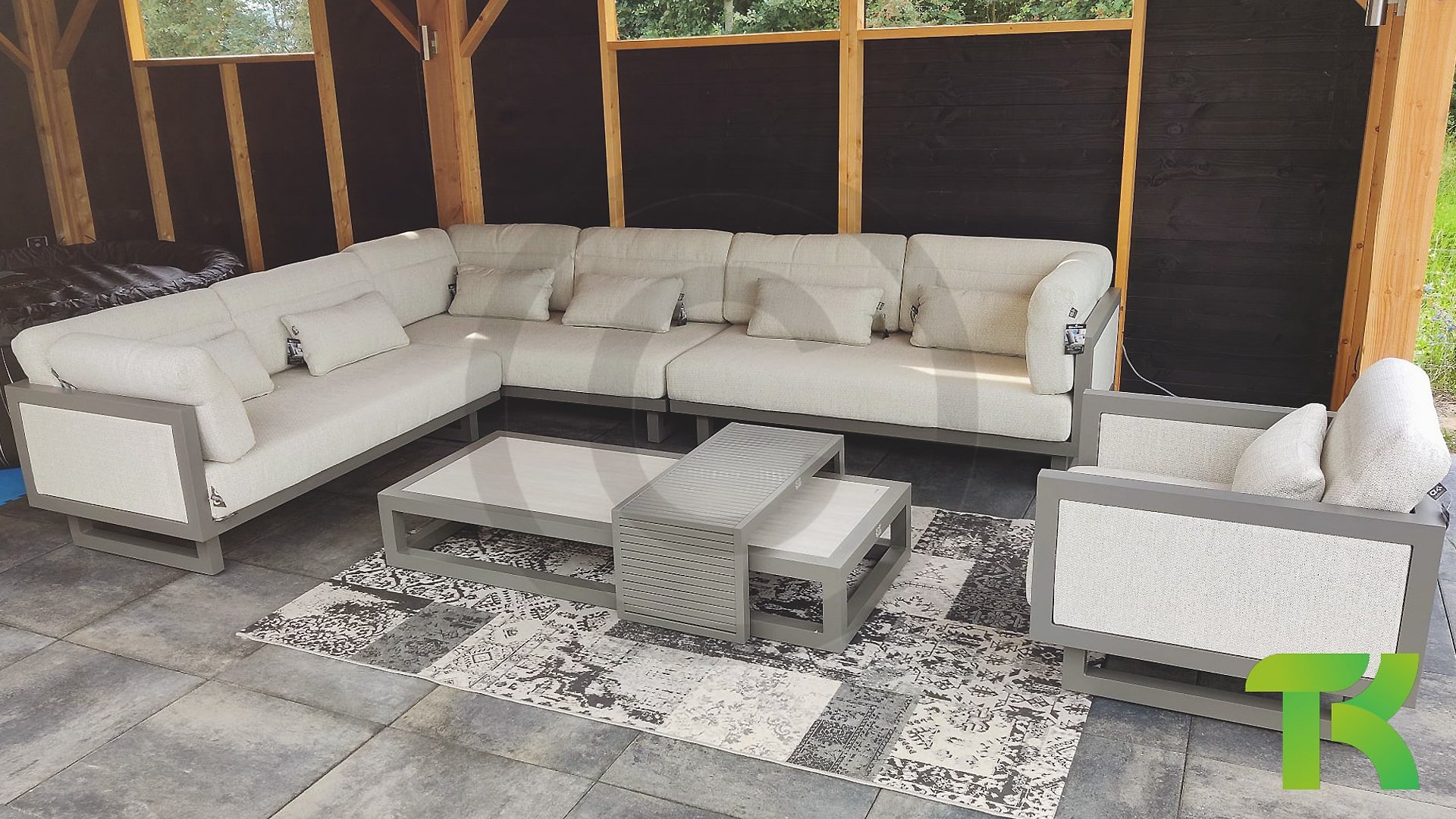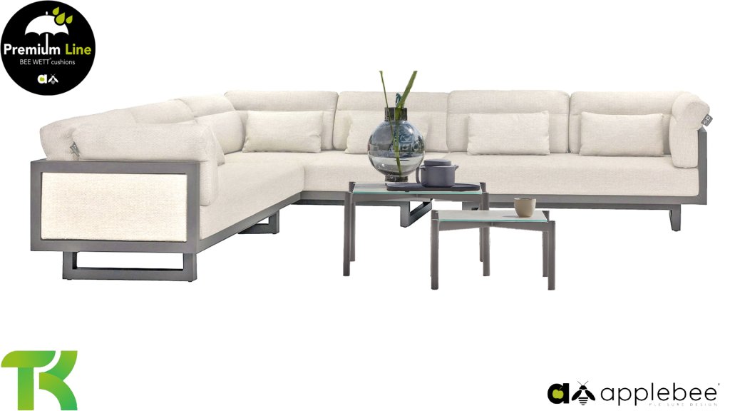 Apple Bee Santorini Lounge: Wenn Sie ein straffes und kubistisches Lounge-Set mögen, aber nicht auf Eigenwilligkeit verzichten möchten... hier ist Santorini! Ein straffes, Aluminium-Vierkantrohrgestell, pulverbeschichtet in warmem Taupe. Dieses Set ist in zwei Ausführungen erhältlich. Der Unterschied liegt in den Paneelen in den Armlehnen und der Rückenlehne, die durch den Rahmen wie ein Gemälde umrahmt wirken. In der ersten Ausführung ist das Paneel mit wunderschön meliertem Seil umwickelt. Dadurch behält das Set Leichtigkeit mit einem zeitgemäßen Look. Die andere Ausführung hat gepolsterte Paneelen im selben Stoff wie die Kissen. Dadurch erhält das Set sofort mehr Klasse und Luxus.