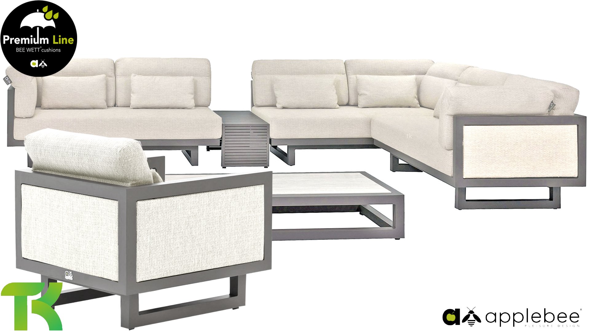 Apple Bee Santorini Lounge: Wenn Sie ein straffes und kubistisches Lounge-Set mögen, aber nicht auf Eigenwilligkeit verzichten möchten... hier ist Santorini! Ein straffes, Aluminium-Vierkantrohrgestell, pulverbeschichtet in warmem Taupe. Dieses Set ist in zwei Ausführungen erhältlich. Der Unterschied liegt in den Paneelen in den Armlehnen und der Rückenlehne, die durch den Rahmen wie ein Gemälde umrahmt wirken. In der ersten Ausführung ist das Paneel mit wunderschön meliertem Seil umwickelt. Dadurch behält das Set Leichtigkeit mit einem zeitgemäßen Look. Die andere Ausführung hat gepolsterte Paneelen im selben Stoff wie die Kissen. Dadurch erhält das Set sofort mehr Klasse und Luxus.