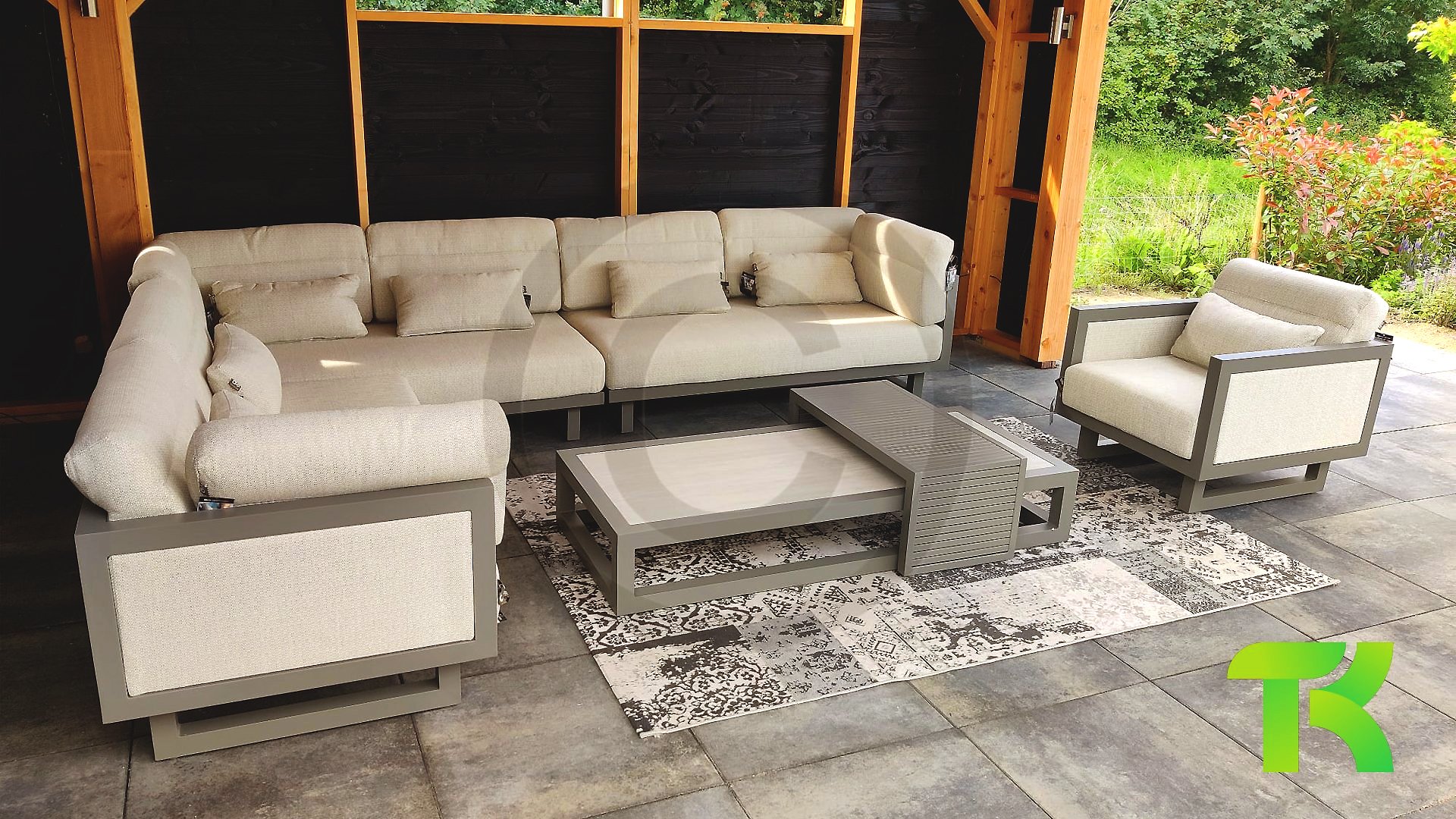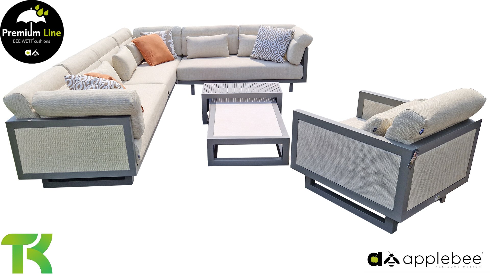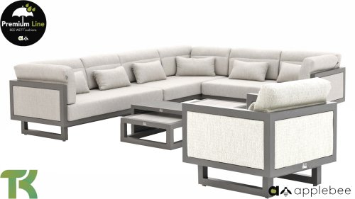 Apple Bee Santorini Lounge: Wenn Sie ein straffes und kubistisches Lounge-Set mögen, aber nicht auf Eigenwilligkeit verzichten möchten... hier ist Santorini! Ein straffes, Aluminium-Vierkantrohrgestell, pulverbeschichtet in warmem Taupe. Dieses Set ist in zwei Ausführungen erhältlich. Der Unterschied liegt in den Paneelen in den Armlehnen und der Rückenlehne, die durch den Rahmen wie ein Gemälde umrahmt wirken. In der ersten Ausführung ist das Paneel mit wunderschön meliertem Seil umwickelt. Dadurch behält das Set Leichtigkeit mit einem zeitgemäßen Look. Die andere Ausführung hat gepolsterte Paneelen im selben Stoff wie die Kissen. Dadurch erhält das Set sofort mehr Klasse und Luxus.