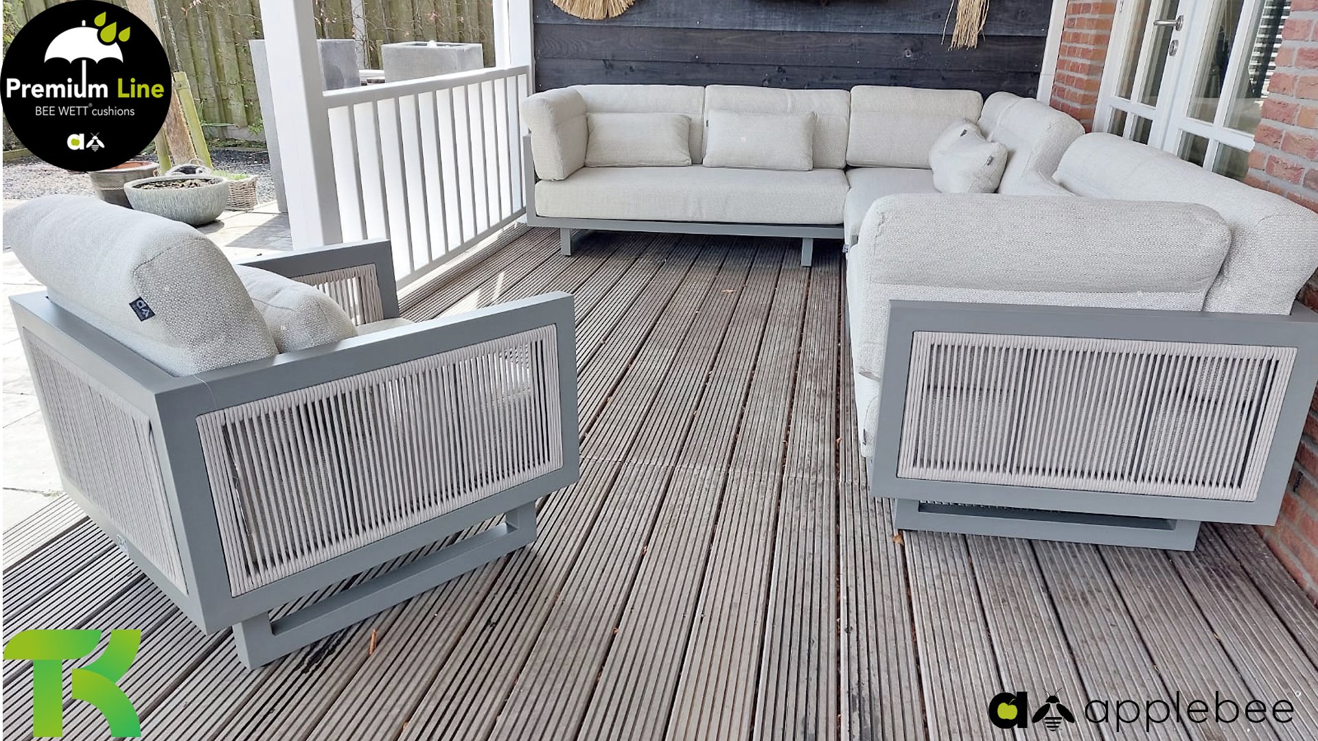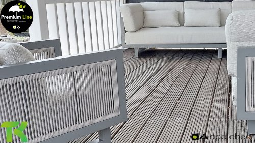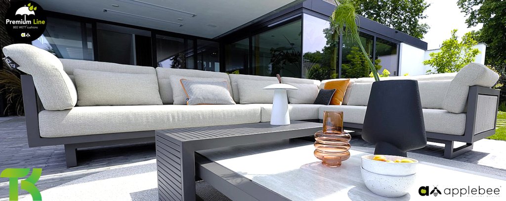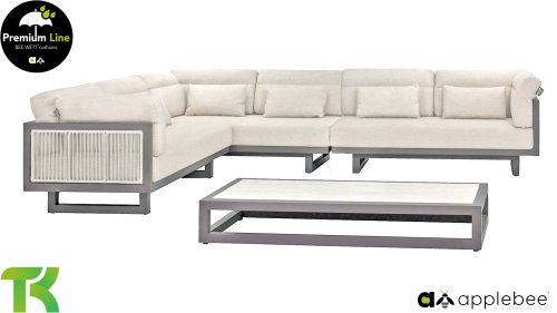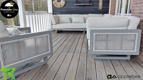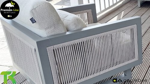 Apple Bee Santorini Lounge Rope: Wenn Sie ein elegantes und kubistisches Lounge-Set mögen, aber keine Kompromisse bei Launen eingehen wollen … schauen Sie hier, das Santorini! Ein schlanker Vierkantrohrrahmen aus Aluminium, pulverbeschichtet in warmem Taupe. Dieses Set ist in zwei Versionen erhältlich. Der Unterschied liegt in den Paneelen in den Armen und im Rücken, die wie ein Gemälde vom Rahmen eingerahmt zu sein scheinen. In der ersten Version ist das Panel mit einem schönen gemischten Seil umwickelt. Dadurch bleibt das Set luftig mit einem zeitgemäßen Look. Die andere Version hat gepolsterte Paneele im gleichen Stoff wie die Kissen. Das verleiht dem Set sofort mehr Klasse und Luxus. Die Arm- und Rückenkissen des Santorini sind etwas Besonderes und biegen sich leicht über die Armlehnen. Sie verleihen den ansonsten klaren Linien einen weichen Touch. Dadurch können Sie sich auch bequem hinlegen. Bequeme Lendenkissen sind im Lieferumfang des Santorini enthalten. So können Sie sich voll und ganz einleben und auch an kühleren Tagen ein gemütliches Plätzchen schaffen.