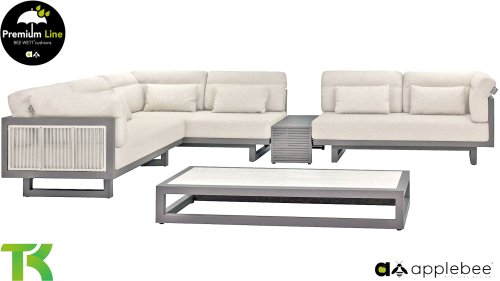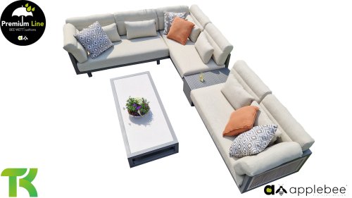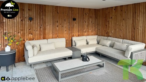 Apple Bee Santorini Lounge Rope: Wenn Sie eine elegante, kubistische Lounge-Garnitur lieben, aber dennoch Wert auf Individualität legen, dann ist die Santorini genau das Richtige für Sie! Ein schlankes, quadratisches Aluminiumrohrgestell, pulverbeschichtet in warmem Taupe. Diese Garnitur ist in zwei Ausführungen erhältlich. Der Unterschied liegt in den Paneelen an Armlehnen und Rückenlehne, die wie ein Gemälde vom Gestell eingerahmt werden. Bei der ersten Ausführung sind die Paneele mit einem wunderschönen, melierten Seil umwickelt. Dies verleiht der Garnitur eine luftige und zugleich moderne Optik. Die zweite Ausführung besticht durch gepolsterte Paneele im gleichen Stoff wie die Kissen und verleiht ihr so einen Hauch von Klasse und Luxus.