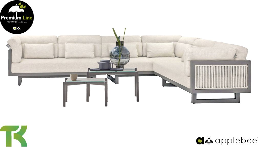 Apple Bee Santorini Lounge Rope: Wenn Sie eine elegante, kubistische Lounge-Garnitur lieben, aber dennoch Wert auf Individualität legen, dann ist die Santorini genau das Richtige für Sie! Ein schlankes, quadratisches Aluminiumrohrgestell, pulverbeschichtet in warmem Taupe. Diese Garnitur ist in zwei Ausführungen erhältlich. Der Unterschied liegt in den Paneelen an Armlehnen und Rückenlehne, die wie ein Gemälde vom Gestell eingerahmt werden. Bei der ersten Ausführung sind die Paneele mit einem wunderschönen, melierten Seil umwickelt. Dies verleiht der Garnitur eine luftige und zugleich moderne Optik. Die zweite Ausführung besticht durch gepolsterte Paneele im gleichen Stoff wie die Kissen und verleiht ihr so einen Hauch von Klasse und Luxus.